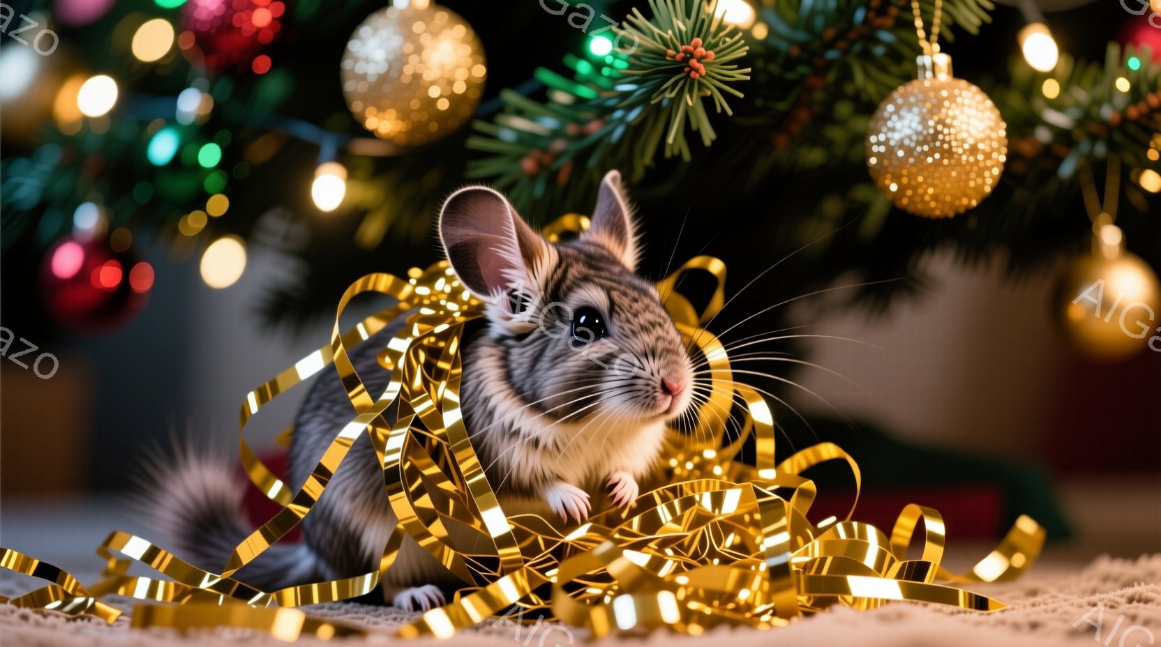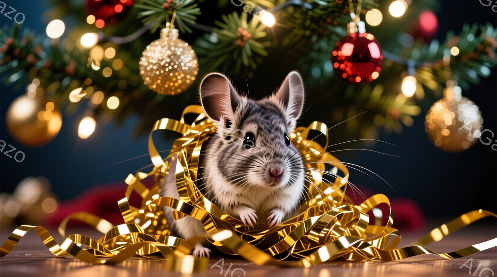 クリスマスツリーの前で、かわいらしいハツカネズミが金色のリボンに囲まれています。つぶらな瞳で正面を見つめ、小さな鼻をピクピク動かしている様子はとても愛らしいです。背景にはぼやけたクリスマスツリーの飾りと緑の葉が見え、暖かくお祝いムードにあふれています。