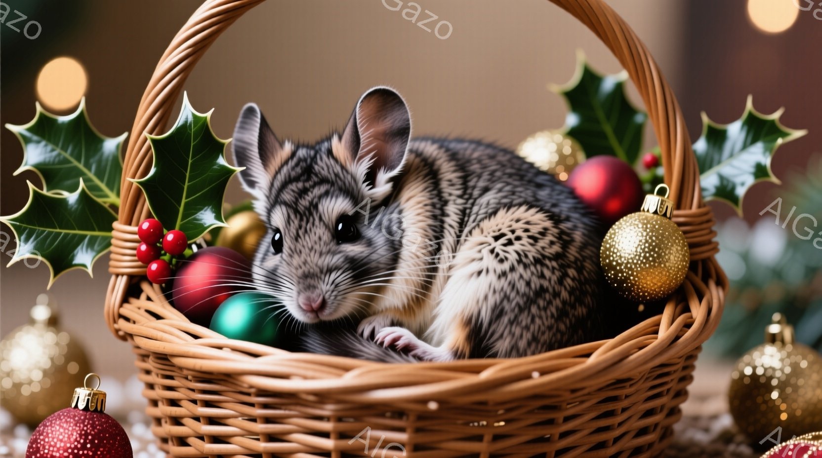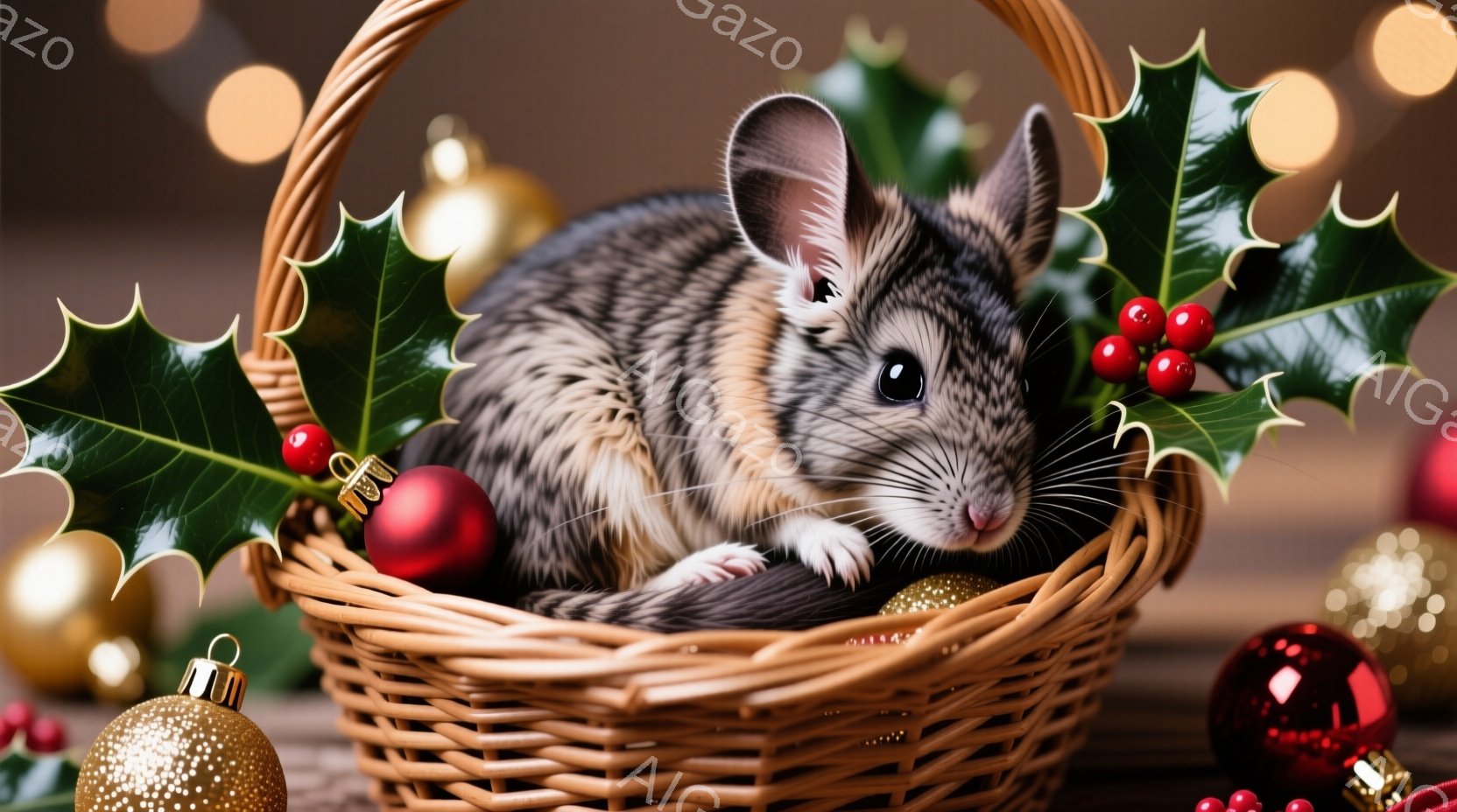 茶色と白の毛並みを持つ小さなネズミが、クリスマスオーナメントと葉で飾られた籐のバスケットの中に丸まって座っています。その表情は穏やかで、少し眠たげな印象を与え、背景にはぼやけた光の玉が散りばめられています。全体的に、温かく、居心地の良いクリスマスの雰囲気が漂っています。