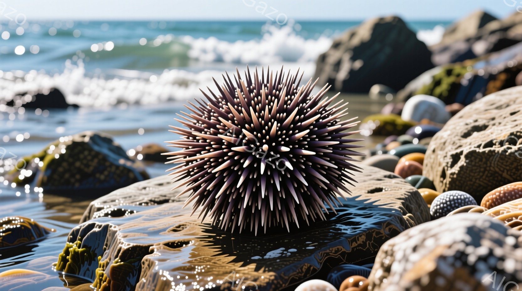 砂浜の岩の上に、棘だらけのウニが置かれている。背景には青い海が広がり、白い波が砕けている様子が見える。全体的に自然光が差し込み、岩やウニの質感が強調された、静かで穏やかな雰囲気である。