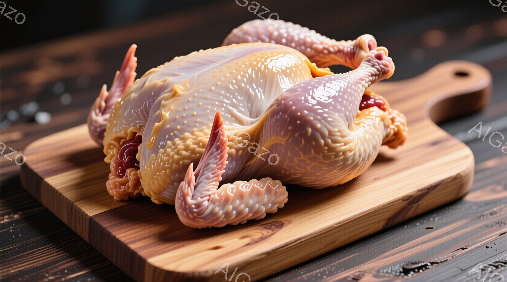 茶色の木製カッティングボードの上に、解体された鶏が置かれています。鶏はピンクがかった白身で、翼や脚がはっきりと見えます。ボードの横にはナイフと小さな赤い果実、緑色の葉が添えられ、素朴で食欲をそそる雰囲気を醸し出しています。