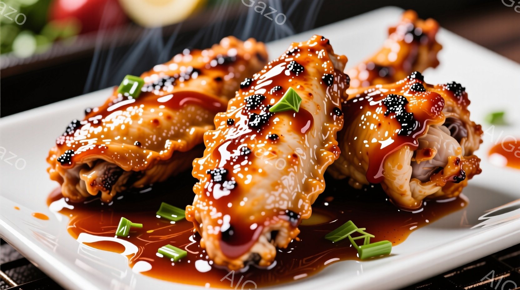 照り映える甘辛いタレが塗られた鶏の唐揚げが、パーチメントペーパーを敷いた黒いトレーに盛られています。みじん切りの緑色のネギが添えられ、蒸気が立ち上る様子から、焼きたてであることがわかります。全体的に食欲をそそる、温かい雰囲気が漂っています。