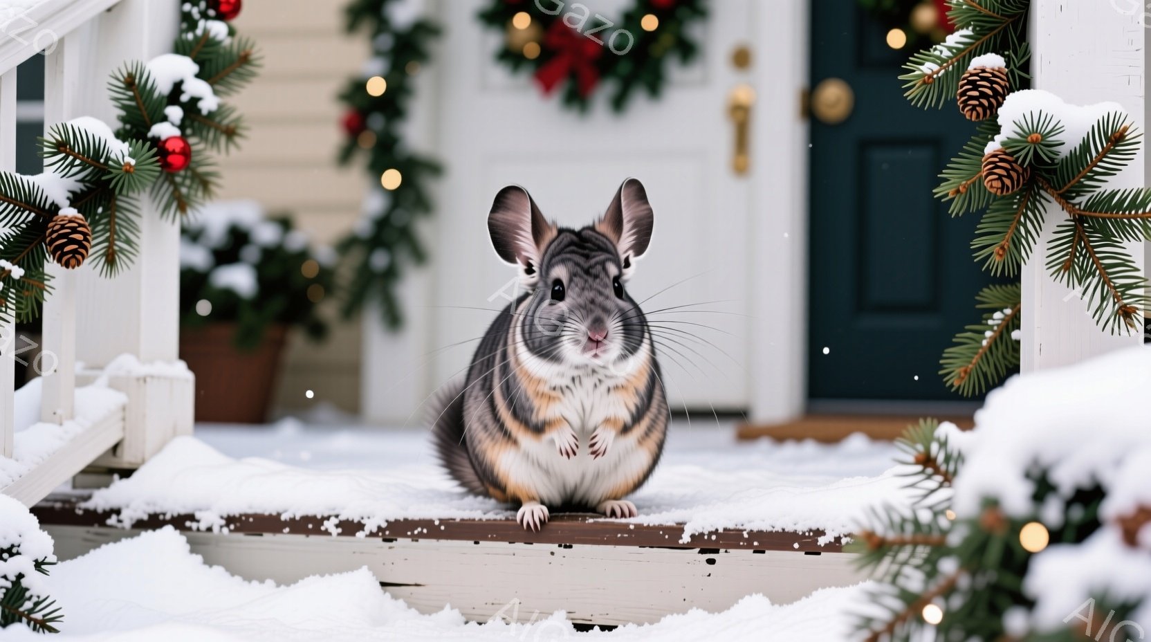 白い雪に覆われた家の階段に、縞模様の可愛らしいチンチラが座っています。ふっくらとした体つきで、丸い耳を立て、少し警戒したような、好奇心旺盛な表情をしています。背景にはクリスマス飾りが施された玄関ドアが見え、冬の暖かく穏やかな雰囲気が漂っています。
