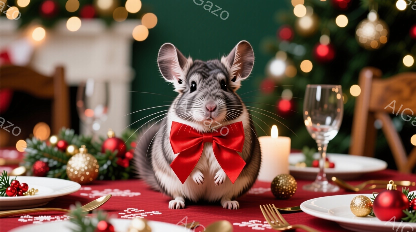 モルモットが赤い蝶ネクタイと赤いリボンをつけて、テーブルの正面に座っています。背景にはクリスマスツリーやプレゼント、キャンドルが飾られ、テーブルにはクリスマスの飾りや食器が並んでいます。全体的に華やかで温かいクリスマスの雰囲気が漂っています。