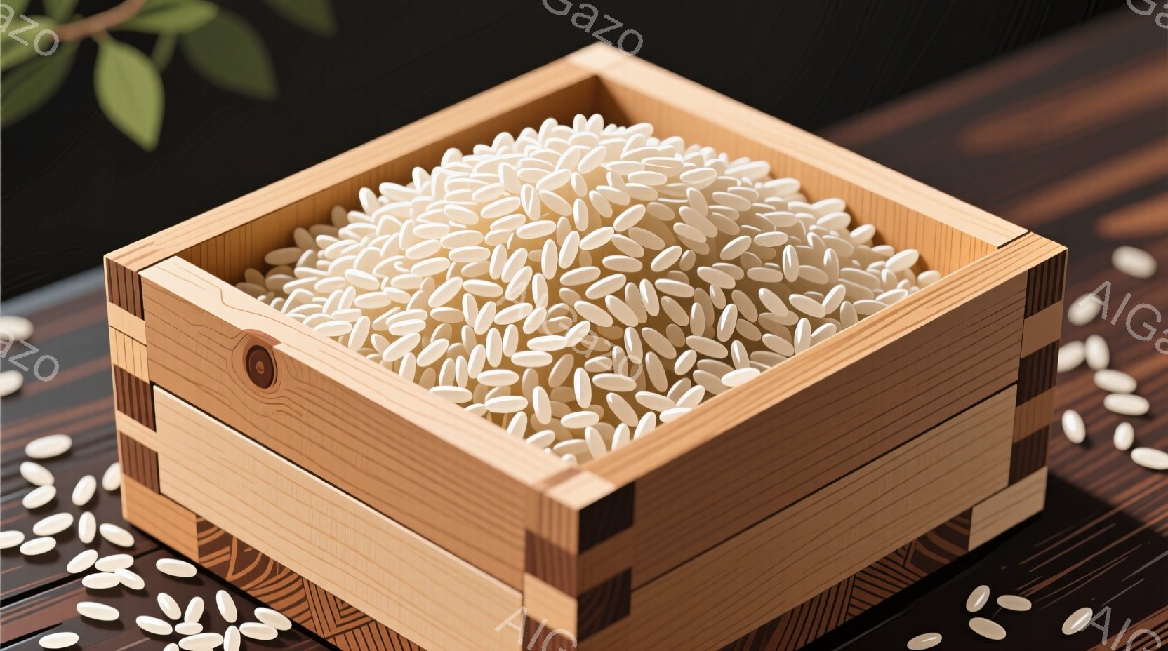 木製の枡の中に白米がたっぷり入っている様子が写っています。枡は伝統的な和のデザインで、米との組み合わせが日本の食文化を感じさせます。背景は暗い木目調で、米の白さが際立っています。