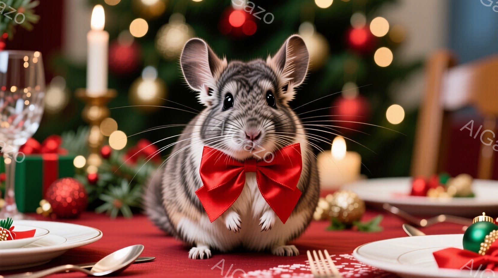 ハムスターが赤い蝶ネクタイを着用し、テーブルの真ん中に座ってこちらを見ています。背景にはクリスマスツリーのぼやけた光と、クリスマスの装飾が施されたダイニングテーブルがあります。全体的に、暖かく、お祝いの雰囲気で、クリスマスディナーをテーマにした写真です。
