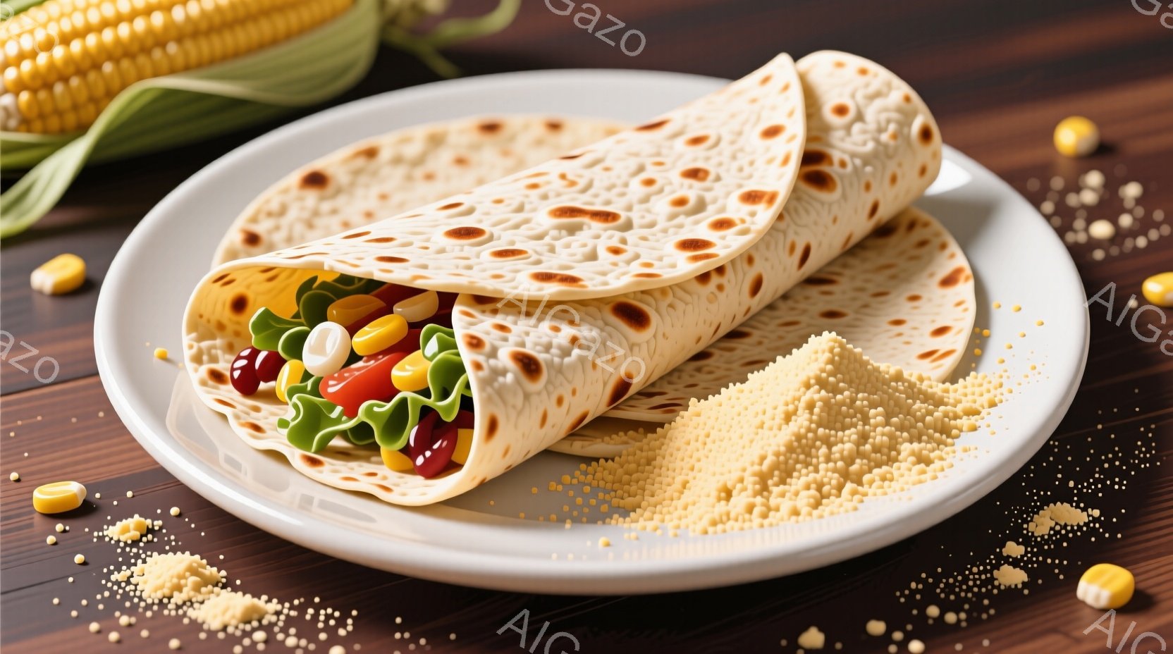 白い皿の上に、2つ巻き寿司のようなものが並んでいます。中にはトウモロコシや豆、茶色の具材が見え、トルティーヤで包まれています。背景にはトウモロコシの穂と、まばらに散らされた黄色い豆があり、全体的に暖色系の食欲をそそる雰囲気です。