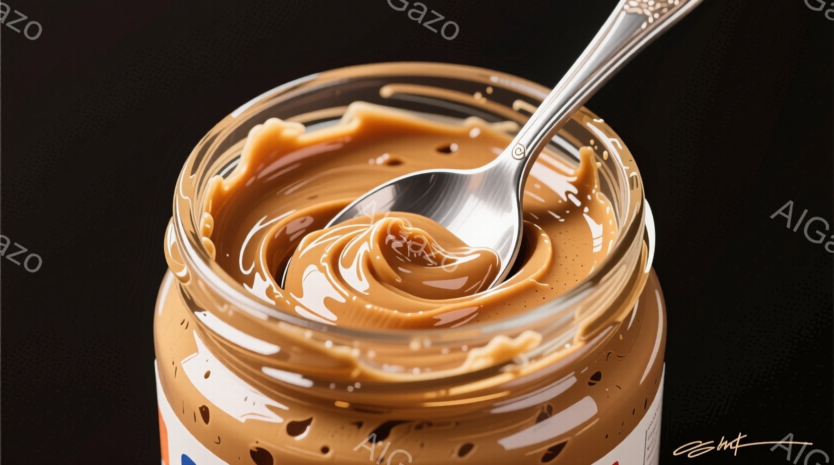 ピーナッツバターが詰まったガラス瓶の俯瞰図で、銀色のスプーンが中に入り、渦巻くピーナッツバターを掬い上げている様子が捉えられている。瓶のラベルは一部しか見えておらず、背景は木目調の明るいテーブルで、全体的に温かみのある、食欲をそそる雰囲気を醸し出している。ピーナッツバターの質感と、スプーンの反射が印象的で、クリームのような滑らかな食感が連想される。