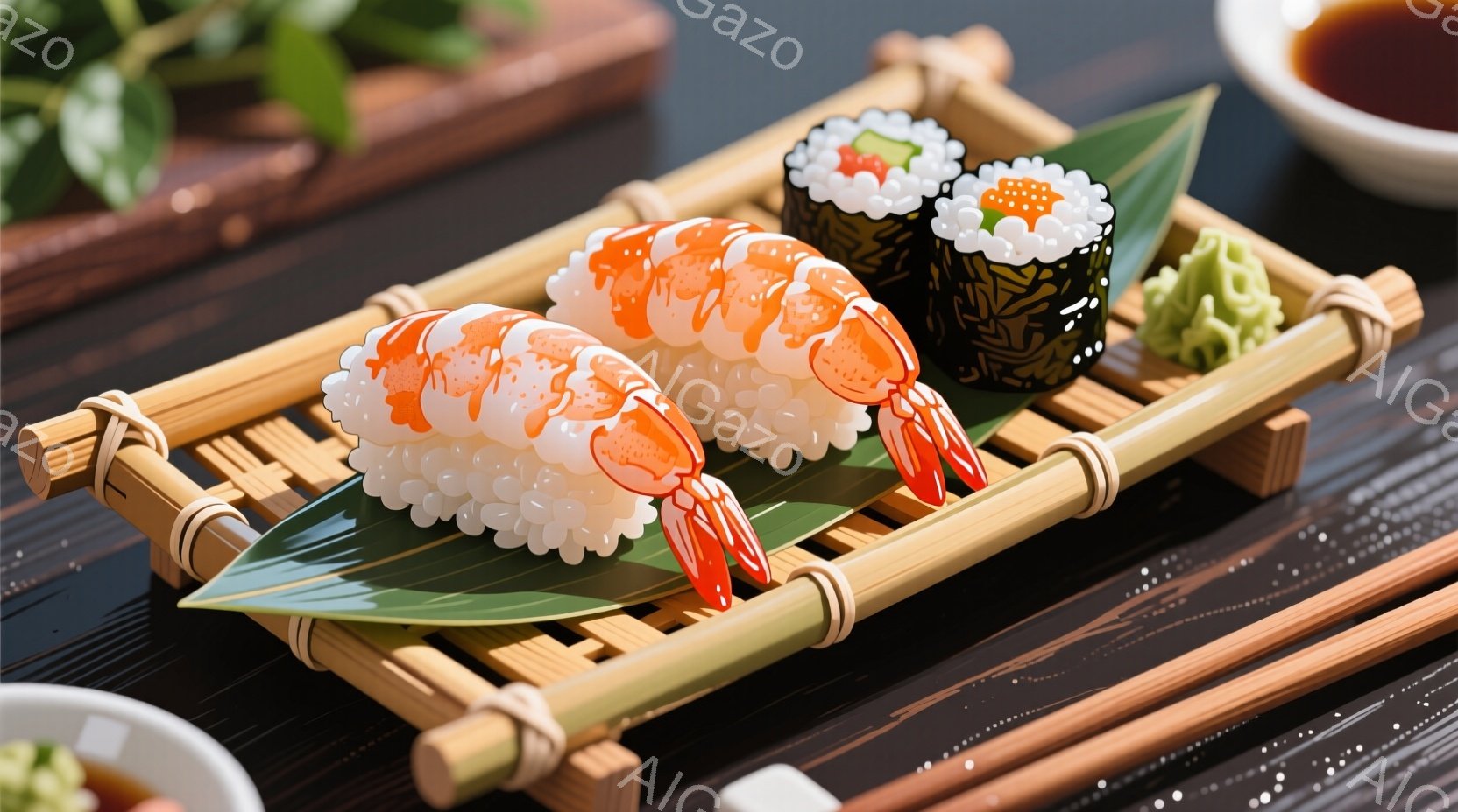 この無料AI生成画像「黒い長方形の皿に、様々な種類の寿司が美しく盛り付けられています。マグロ、サーモン、エビ、イクラなどのネタが使われており、緑色の葉っぱの飾りと一緒におしゃれな盛り付けになっています。背景は木目調で、隣には箸と小さなソースが入った器が見え、美味しさを引き立てています。」は、2025年10月23日に作成されました。 サイズは 1664×928px の高解像度で、商用利用も可能なフリー素材として提供しています。