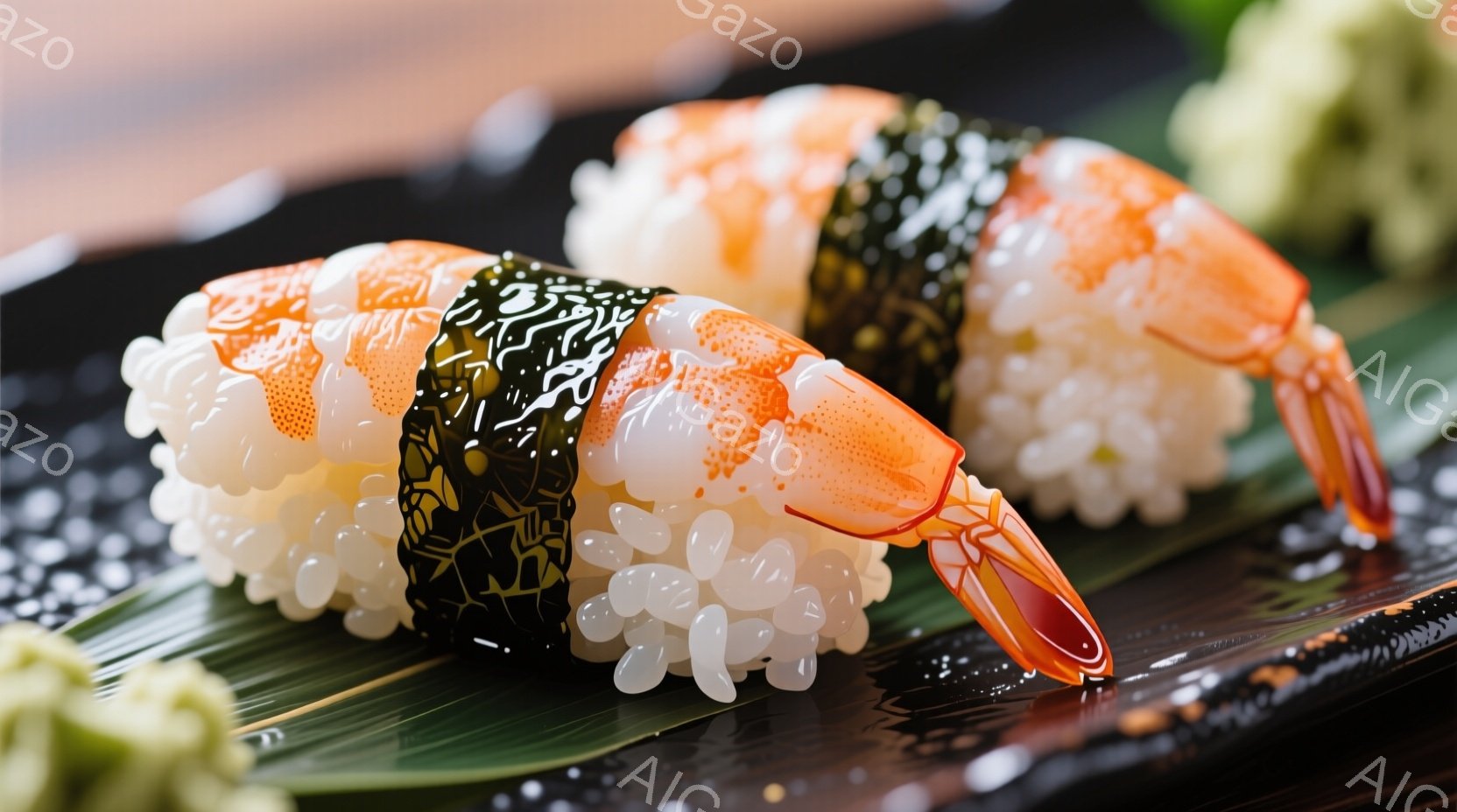海老の寿司が皿の上に置かれており、シャリと海苔で巻かれ、鮮やかなオレンジ色の海老が乗っています。皿は黒色で光沢があり、背景には緑色の添え物がぼやけて見えます。全体的に、新鮮で食欲をそそる印象を与える美しい寿司の写真です。