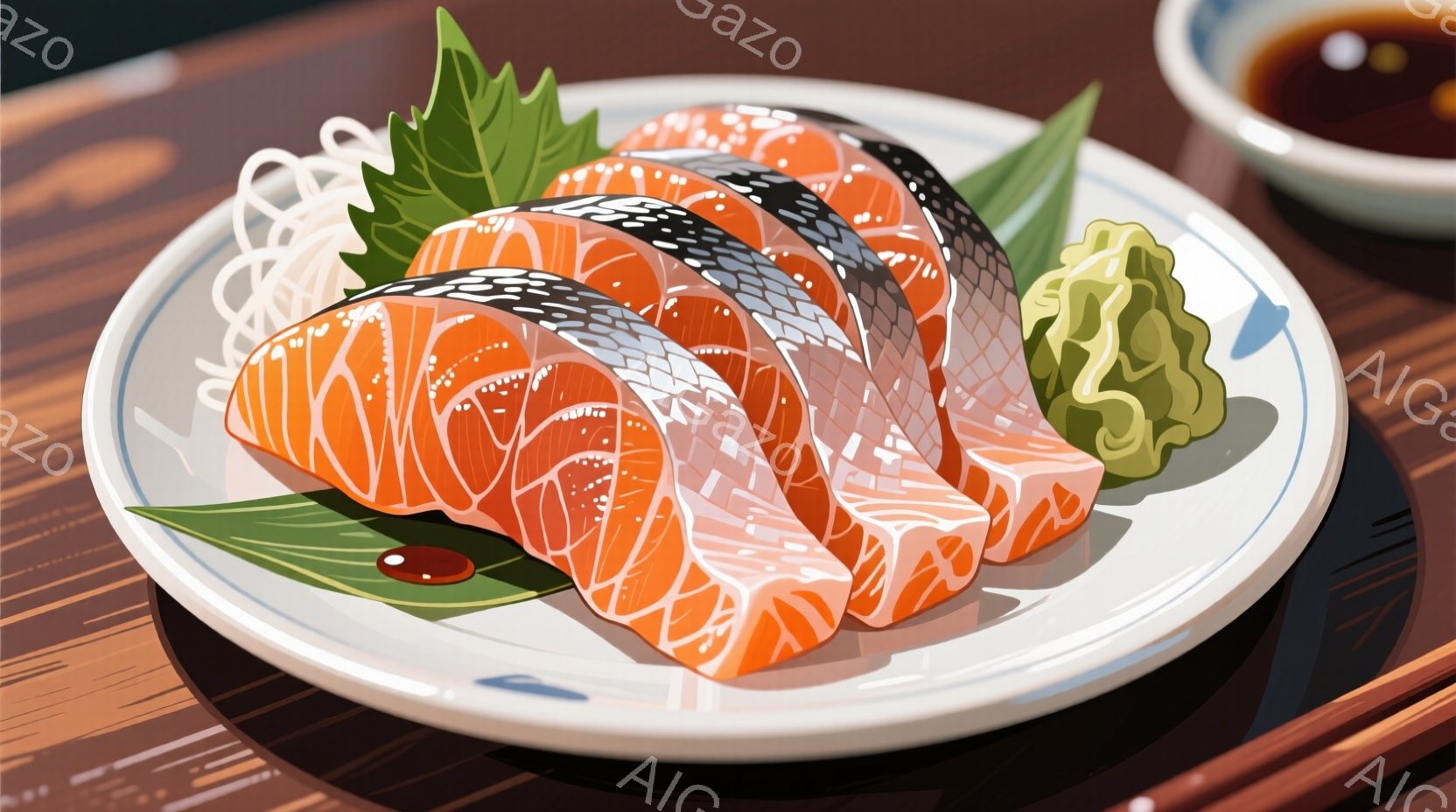 この無料AI生成画像「白い皿にサーモンの刺身が美しく盛り付けられています。鮮やかなオレンジ色の身は、繊細な模様が入り、緑色の葉とレモン、わさびの山と共に、食欲をそそるコントラストを生み出しています。木製のテーブルが背景にあり、上品で落ち着いた雰囲気を醸し出しています。」は、2025年10月23日に作成されました。 サイズは 1664×928px の高解像度で、商用利用も可能なフリー素材として提供しています。