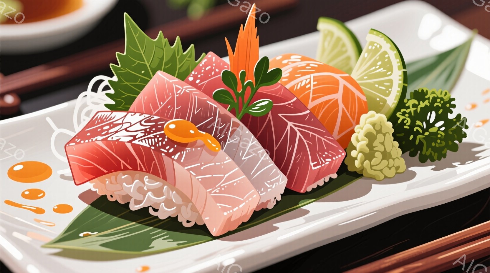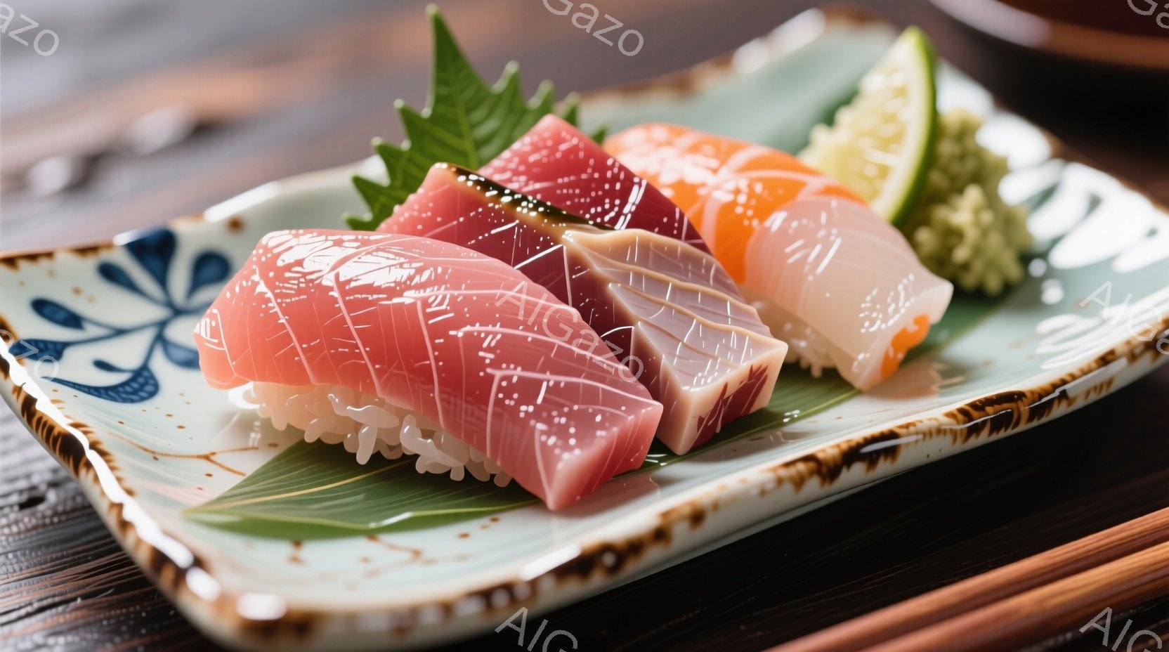 鮮やかなピンク色のマグロの刺身が、葉と醤油、わさびと共に、装飾的な四角い皿に盛り付けられています。皿は藍色と金色の模様で飾られており、背景には木製のテーブルが見えます。全体的に洗練された雰囲気で、日本の食文化を彷彿とさせます。
