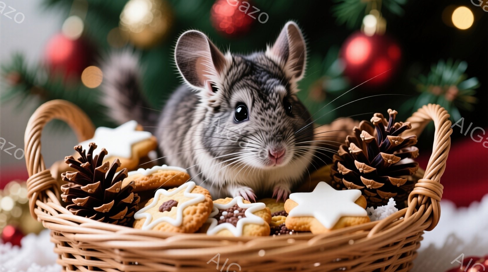 籠の中に可愛らしい灰色がかった茶色のネズミが座っており、クリスマスのクッキーと松ぼっくりに囲まれています。ネズミは前足を組み、好奇心とわずかな警戒心を込めた表情でカメラを見つめています。背景にはぼやけたクリスマスツリーの緑と装飾が確認でき、暖かく、お祝いムードの漂う冬の光景です。