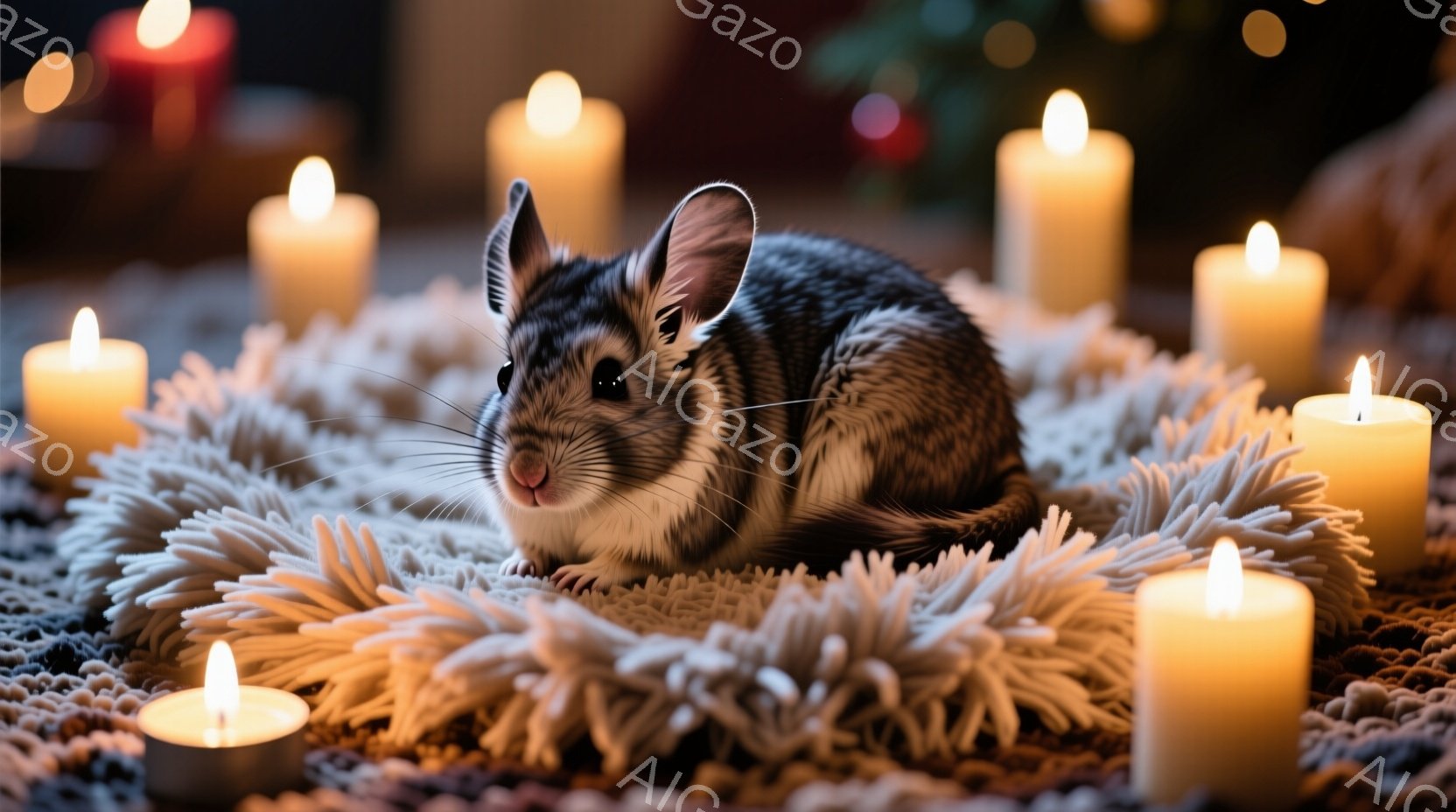 白くふわふわとした敷物の上で、小さなハムスターが丸まって座っています。周囲にはたくさんの白いロウソクが灯っており、暖かく幻想的な雰囲気を醸し出しています。ハムスターは警戒しながらも落ち着いた表情で、優しい光に照らされています。