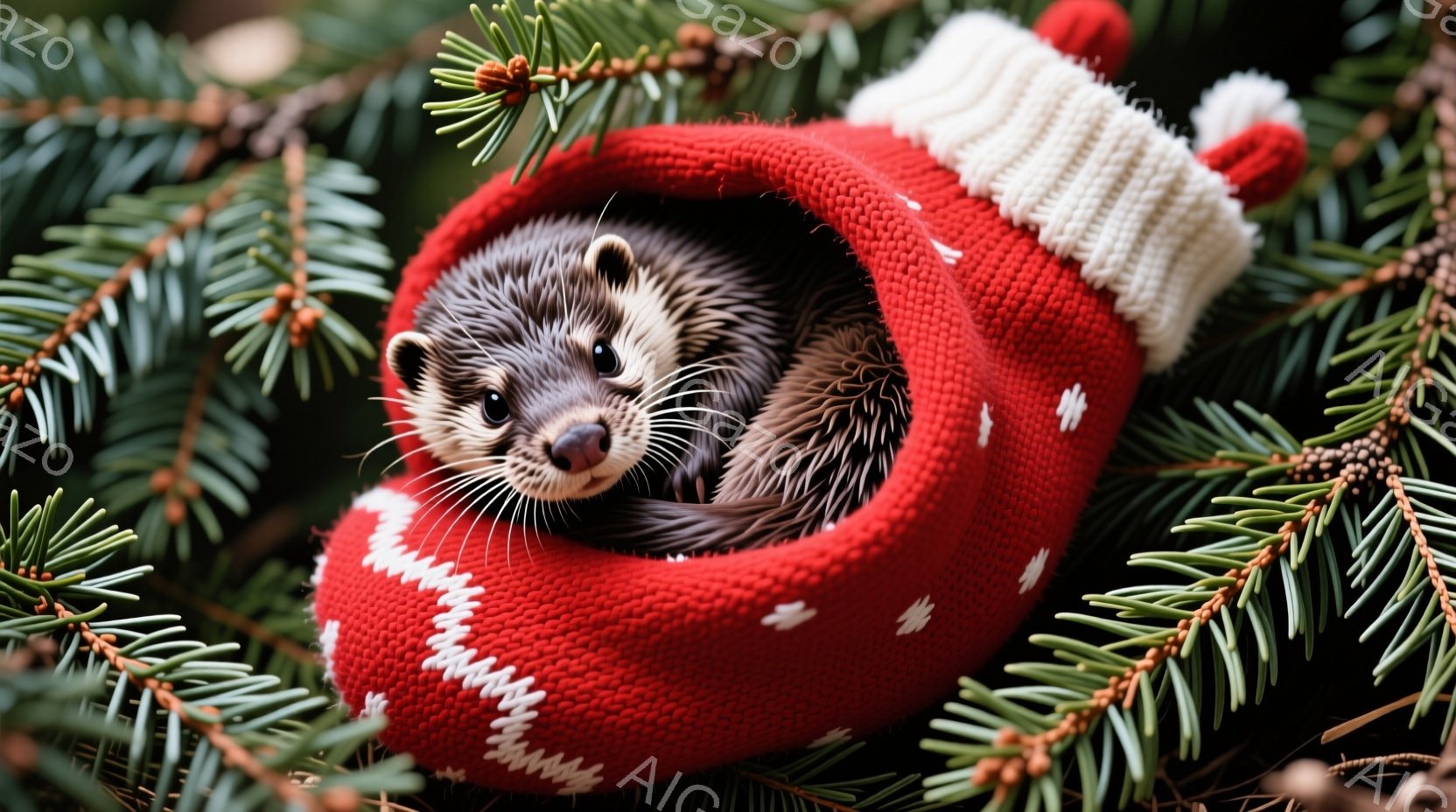 赤い編み物の靴下の中に、かわいらしいイタチが丸まって入っています。イタチは小さく、好奇心に満ちた表情でカメラを見ており、その毛並みは柔らかく、暖かそうです。背景には緑のモミの枝と松ぼっくりが写っており、クリスマスの雰囲気を感じさせる、心温まる光景です。