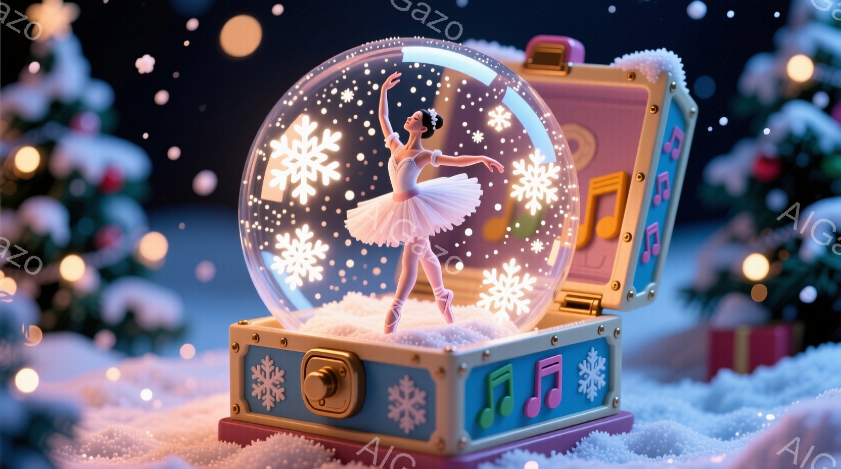雪が降る夜を思わせる、青い宝石箱のような箱の中に、バレリーナが優雅に踊っています。彼女は白いチュールスカートと、頭を高く結んだ髪、そして微笑みを浮かべています。箱の外には雪が積もり、背景にはぼやけた緑色の木々がクリスマスらしい温かく幻想的な雰囲気を作り出しています。