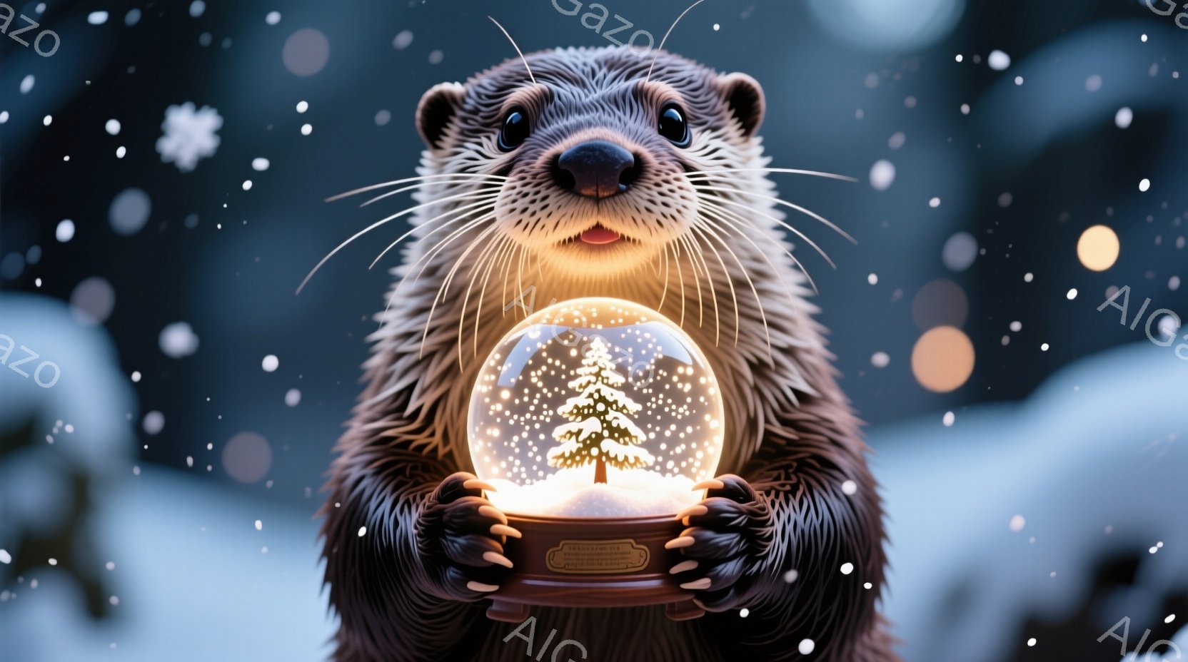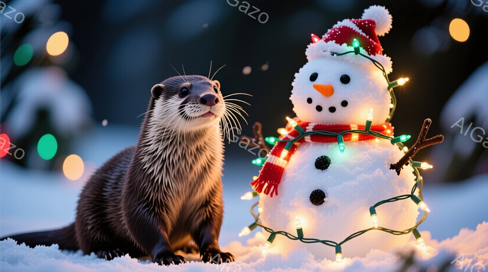白い雪景色の中に、かわいらしいカワウソが立っています。カワウソは前足を伸ばして座り、少し上目遣いでカメラを見ています。背後には、オレンジ色の鼻と炭でできた目を持つ雪だるまが飾られており、カラフルなイルミネーションが巻かれています。