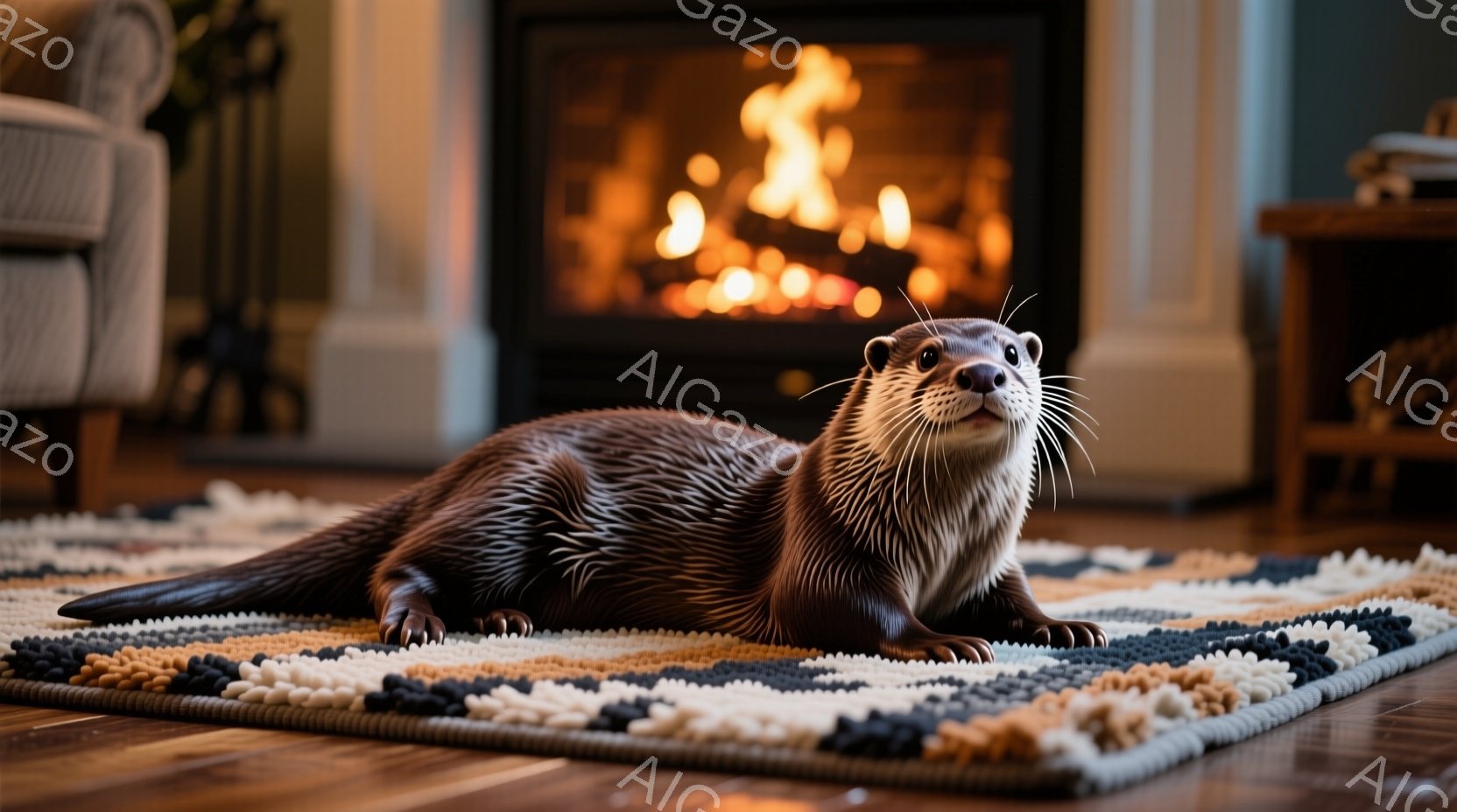 明るい色の絨毯の上にカワウソが横たわっており、カメラの方を見て少し微笑んでいるように見えます。背景には暖炉があり、炎が燃えて暖かく居心地の良い雰囲気を作り出しています。部屋は木製の床で、クラシックな家具が配置され、リラックスした空間を演出しています。