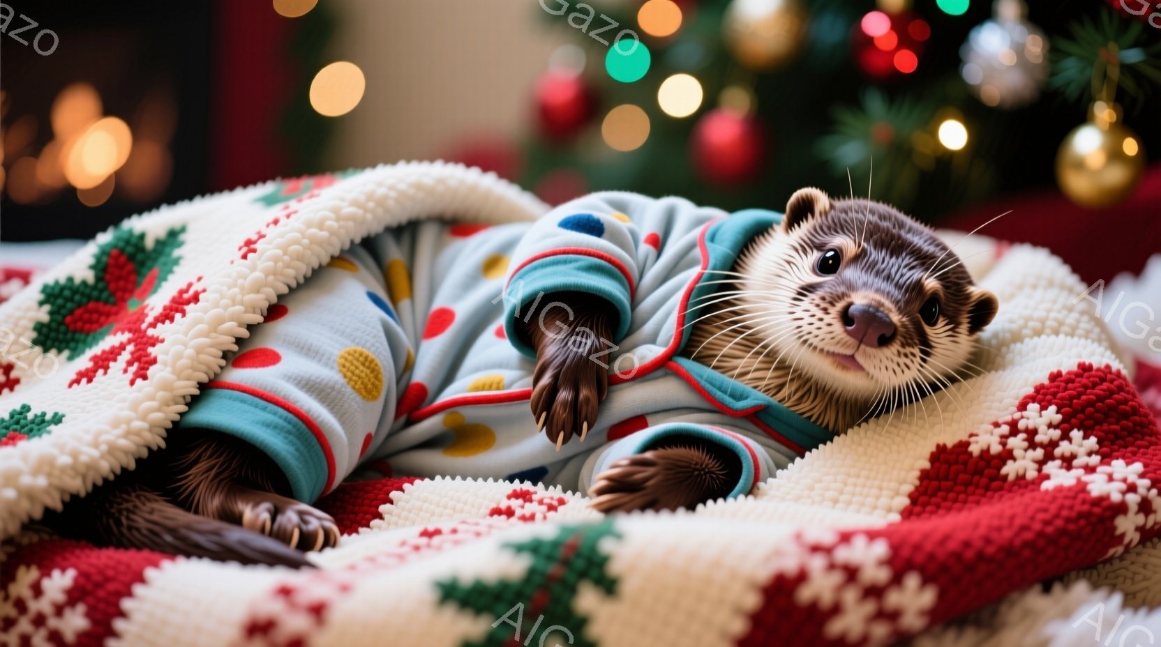 鮮やかな背景のクリスマスツリーとプレゼントの横で、かわいらしいカワウソが水色のクリスマス柄のパジャマを着て仰向けに寝ています。その表情はリラックスしており、前足は体の前に伸ばし、まるで人間のように安らかに眠っているように見えます。白いふわふわの毛布がカワウソを包み込み、温かく、お祝いムードに満ちた雰囲気を醸し出しています。