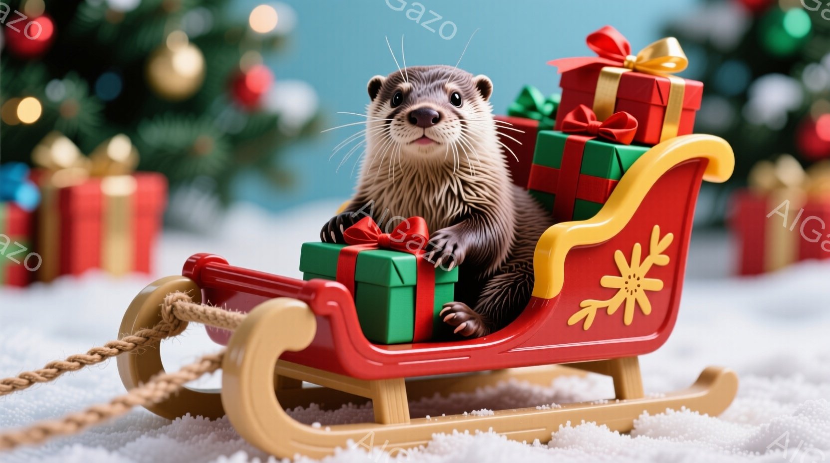 白い柵の上にカワウソが立っており、雪が降る冬の風景です。柵には、赤いリボンと緑の葉っぱで作られたクリスマスデコレーションが施されており、可愛らしい雰囲気を醸し出しています。背景はぼやけていますが、雪景色とクリスマスの装飾が合わさり、温かく穏やかな冬の雰囲気を伝えています。