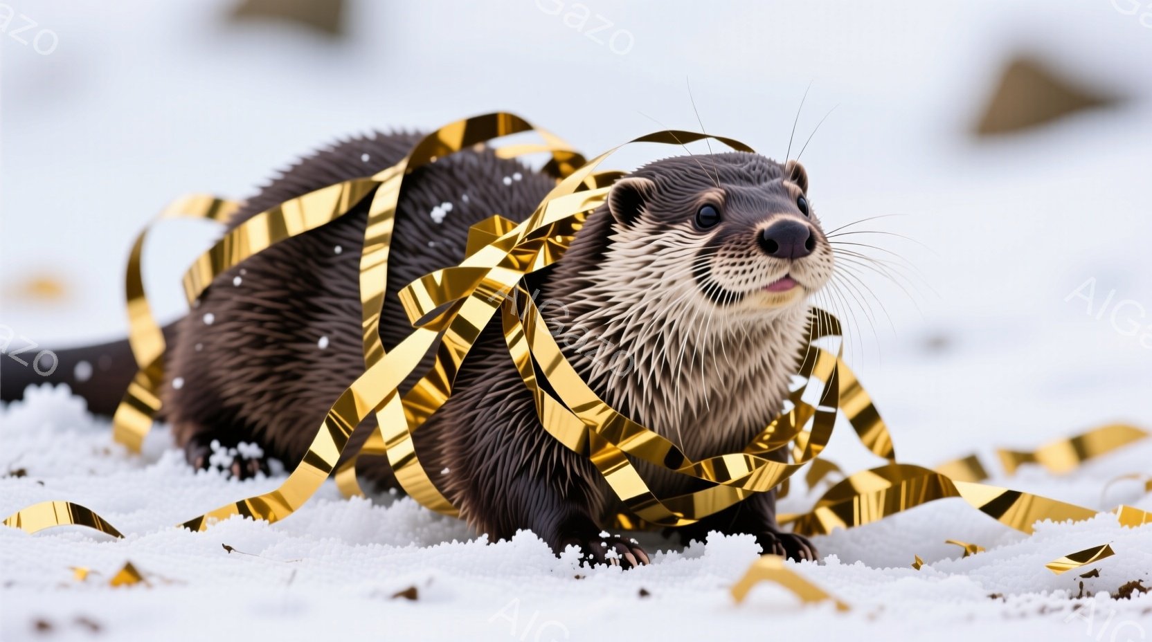 茶色のカワウソが雪の上に横たわっており、金色のリボンがその周りに散らばっている。カワウソは前足を伸ばし、穏やかな表情でカメラを見つめている。背景は雪景色で、全体的に柔らかく温かい雰囲気を醸し出している。