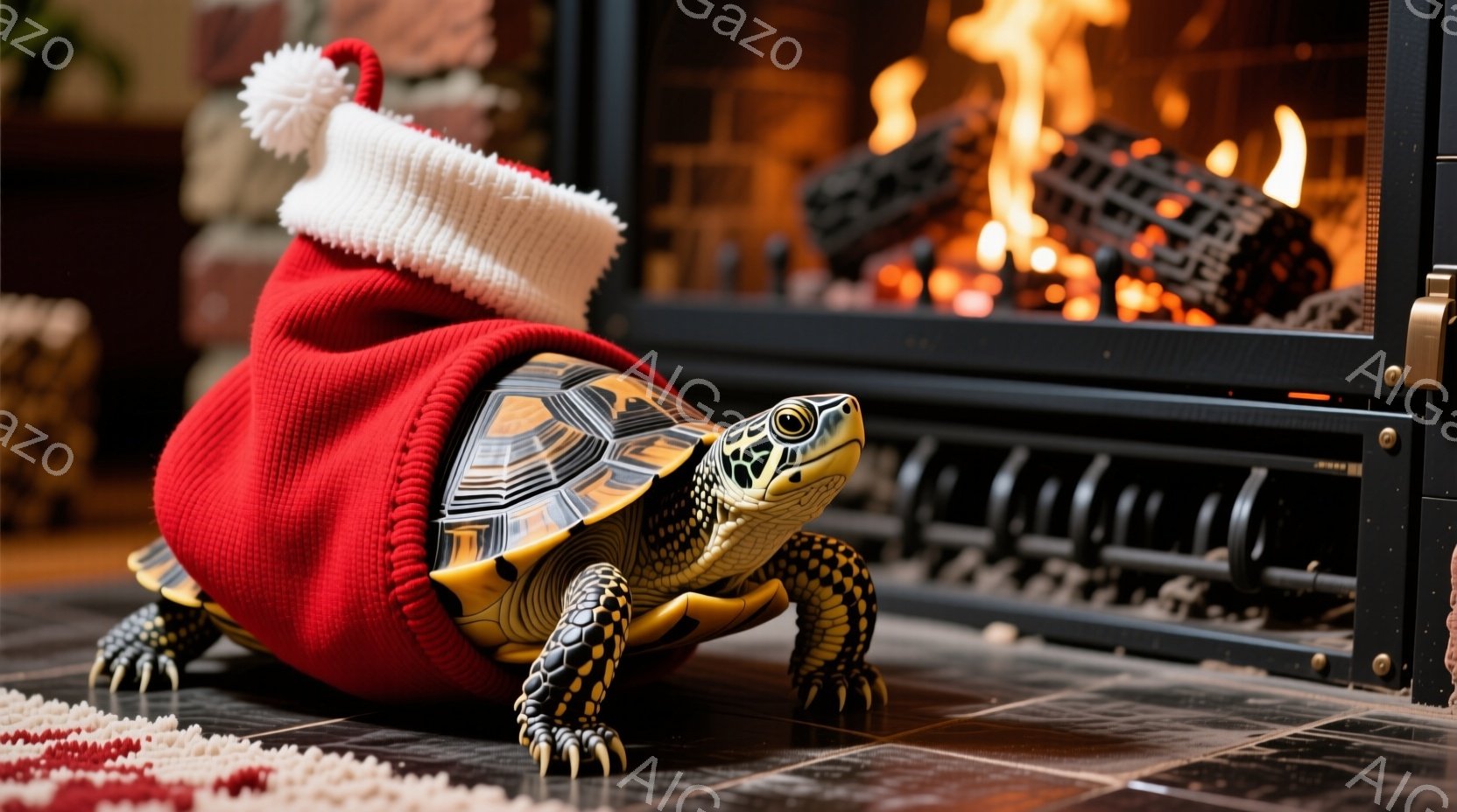 カメがクリスマスツリーの前で、頭に赤いサンタ帽をかぶって正面を見つめています。ツリーは緑の葉と金色のオーナメントで飾られ、背景にはぼやけた光が散りばめられています。雪が散りばめられた地面と、カメの鋭い視線が、冬の暖かい雰囲気を醸し出しています。