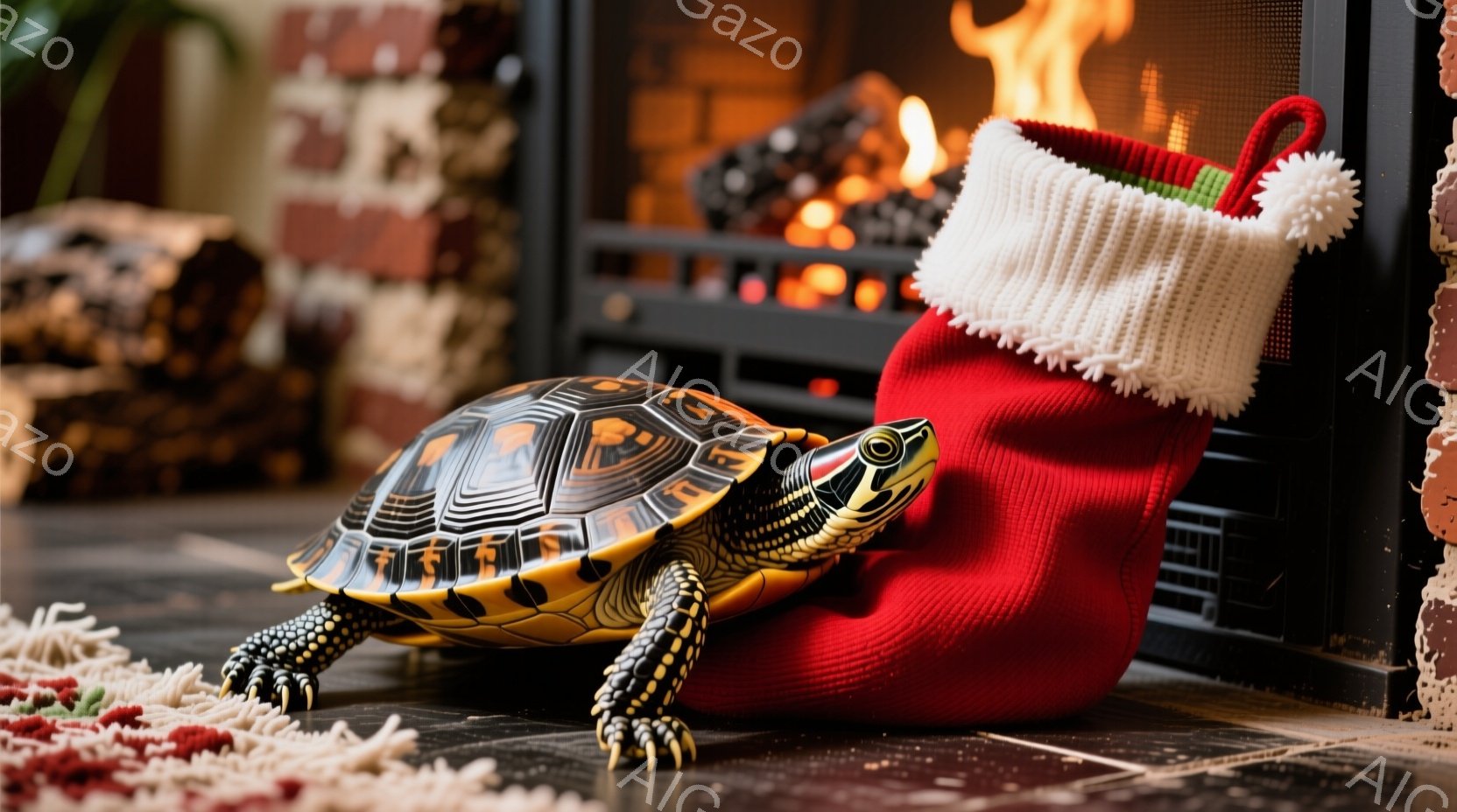 赤いニットの服とサンタ帽をかぶったカメが、床の上を歩いている様子が写っている。背景には暖炉があり、炎が燃え盛っているため、温かく居心地の良い雰囲気が漂っている。床はタイル張りで、カメの足元には赤い模様の敷物が敷かれている。