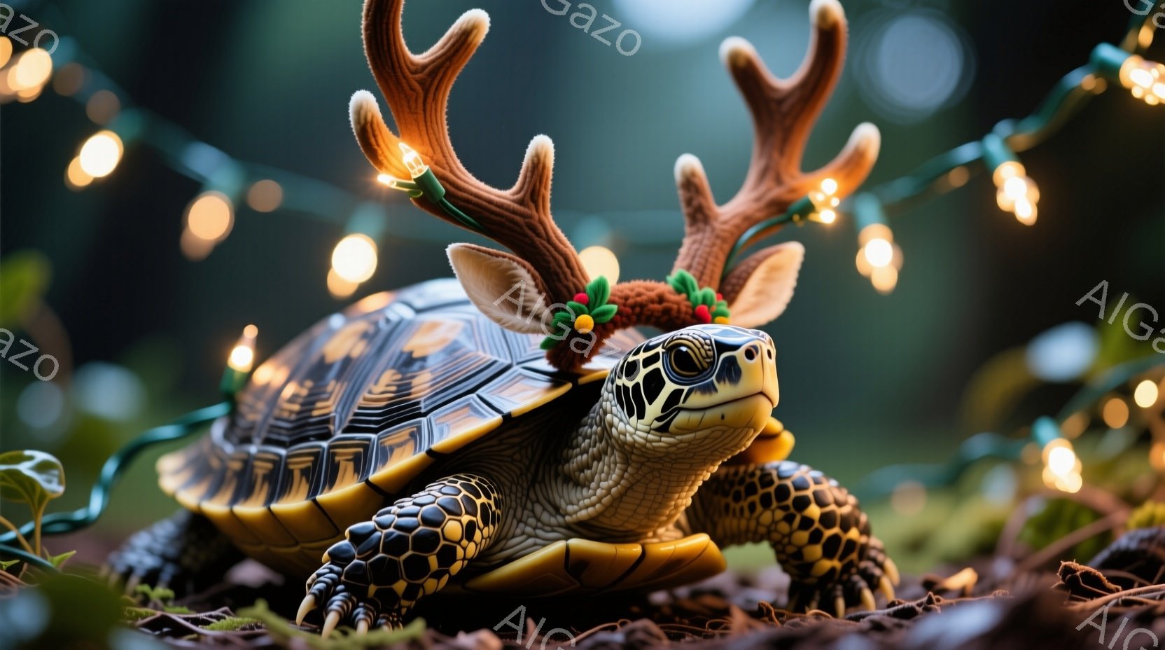 鮮やかな甲羅を持つ亀が、頭に角の飾りを付けて正面を見つめている。背景にはぼやけた自然の風景と、光る小さな電球が散りばめられており、どこか幻想的な雰囲気を醸し出している。亀の表情は穏やかで、どこかユーモラスな印象を与える。