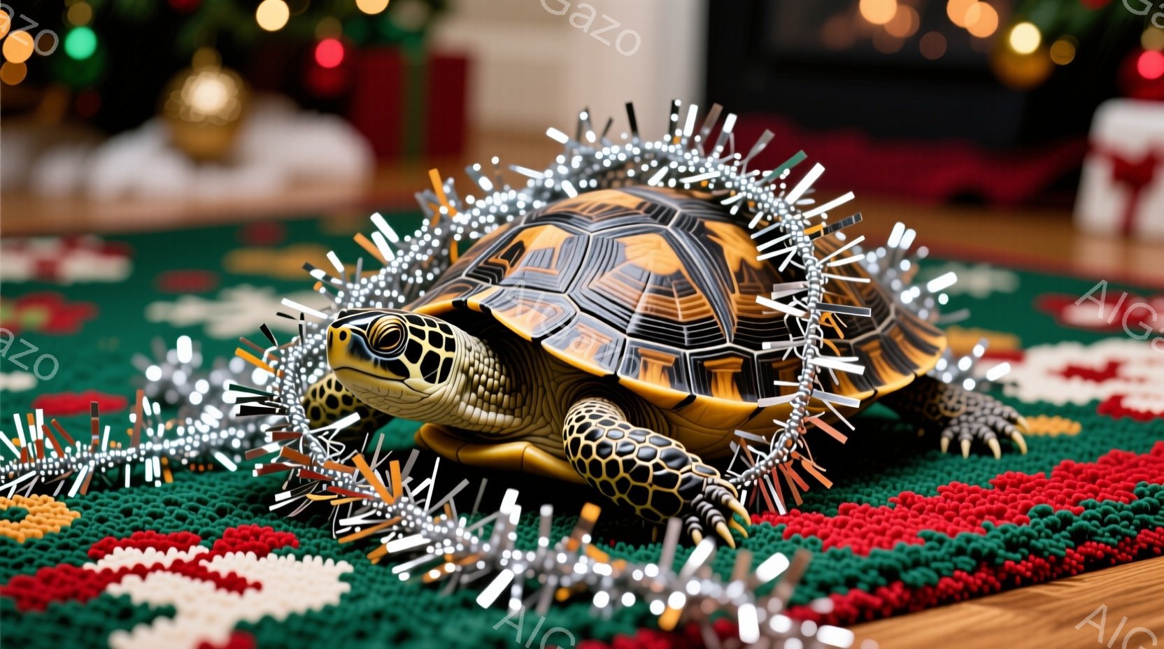 白い雪の上に、甲羅に美しい模様のあるカメが休んでいます。カメはホリデーシーズンを象徴する赤い実のついた葉をくわえており、冬の自然の中で独特の存在感を放っています。背景には白い家と雪が積もった階段が見え、静かで穏やかな冬の雰囲気が漂っています。