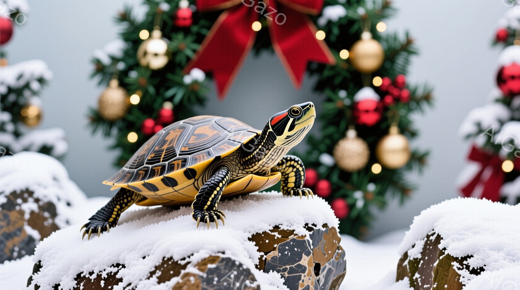 雪をまとった岩の上にいる小さな亀が写っています。亀は鮮やかな色合いで、特にその甲羅の模様と足の黄色い斑点が印象的です。背景には、クリスマスリースと、雪が降る冬の風景がぼやけて写り込み、全体的に穏やかで祝祭的な雰囲気を醸し出しています。