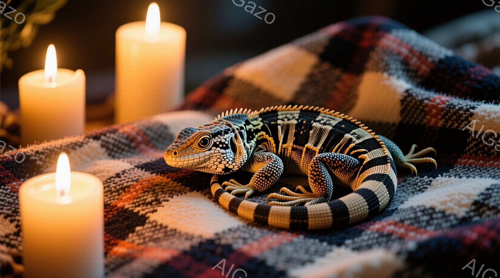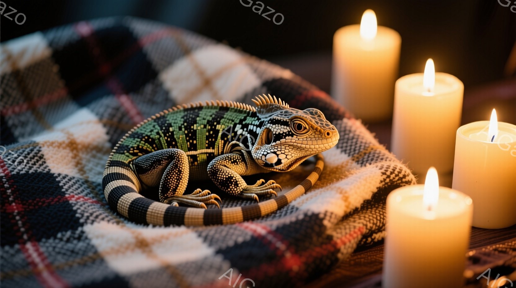 縞模様のトカゲがチェック柄の布の上に丸まって横たわっています。周囲には点灯したキャンドルが配置され、暖かく柔らかな光がトカゲを照らしています。背景は暗く、キャンドルの光が主な光源となっています。