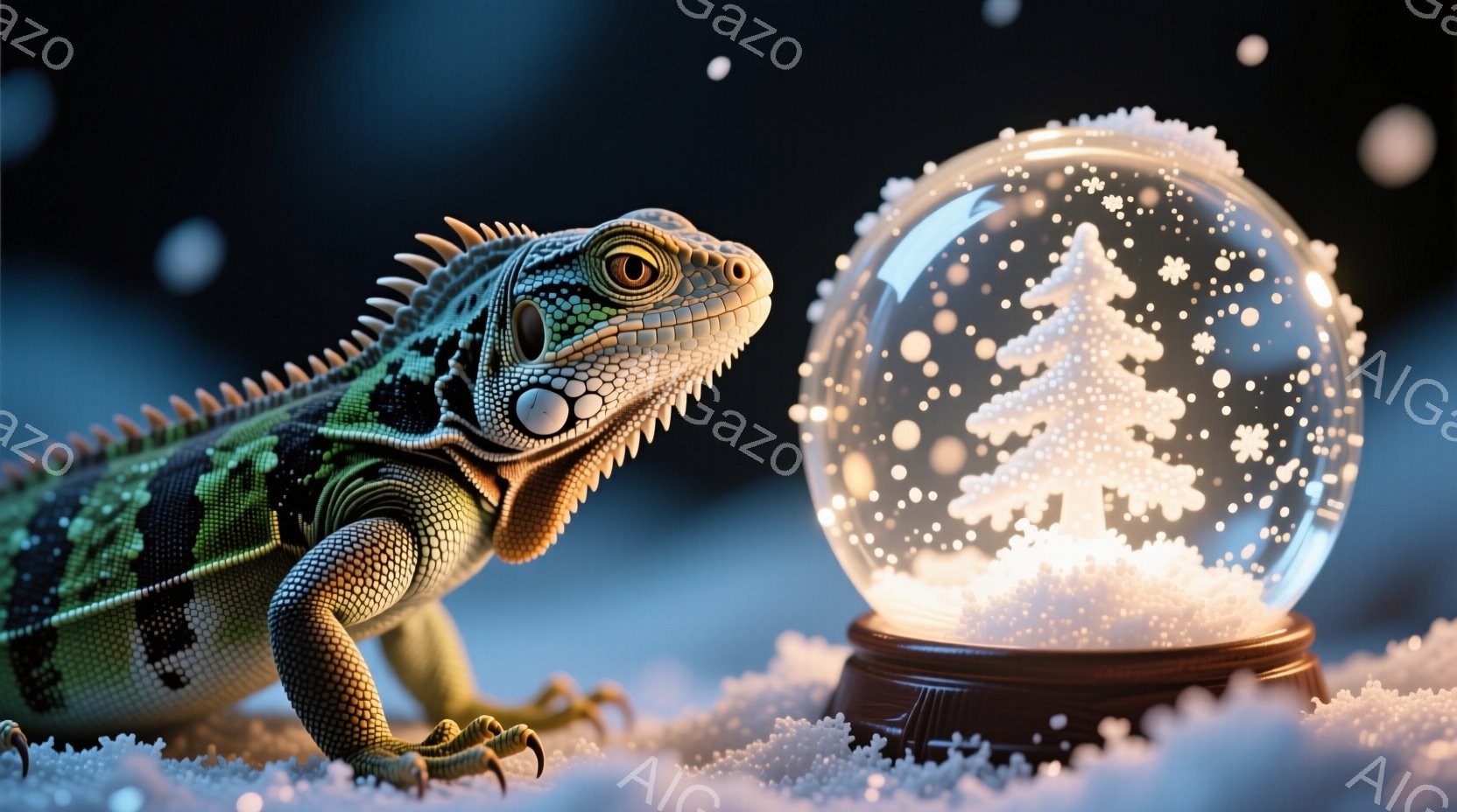 緑色のイグアナが雪景色が閉じ込められたグラスボールを興味津々に見つめています。イグアナは雪の上に横たわり、鋭い爪をむき出しにして、前足を伸ばしています。背景は暗く、グラスボールからの暖かく優しい光が雪の上のイグアナを照らし、冬の幻想的な雰囲気を醸し出しています。