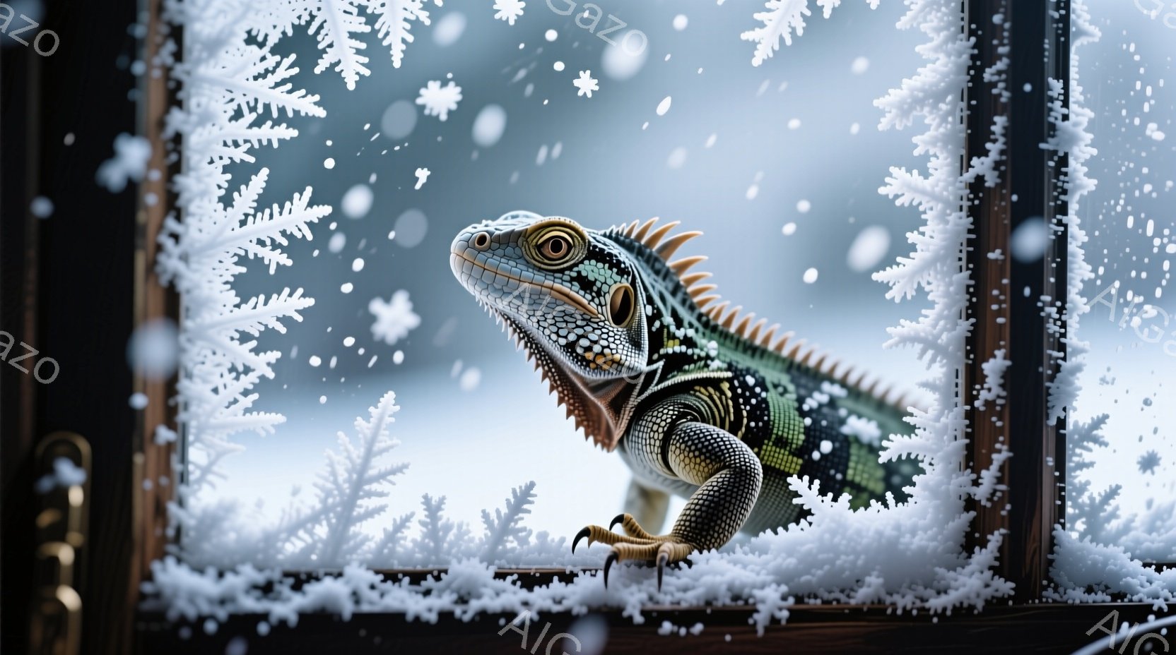 窓枠に霜が降り積もり、その上に緑と黒の美しい模様を持つトカゲがとげとげしい足で立っている。トカゲは鋭い目つきで正面を見つめ、まるで冬の風景を監視しているかのような印象を与える。背景は白くぼやけており、雪が降る冬の日の穏やかさと静けさ、そして少しの寒々しさを感じさせる。