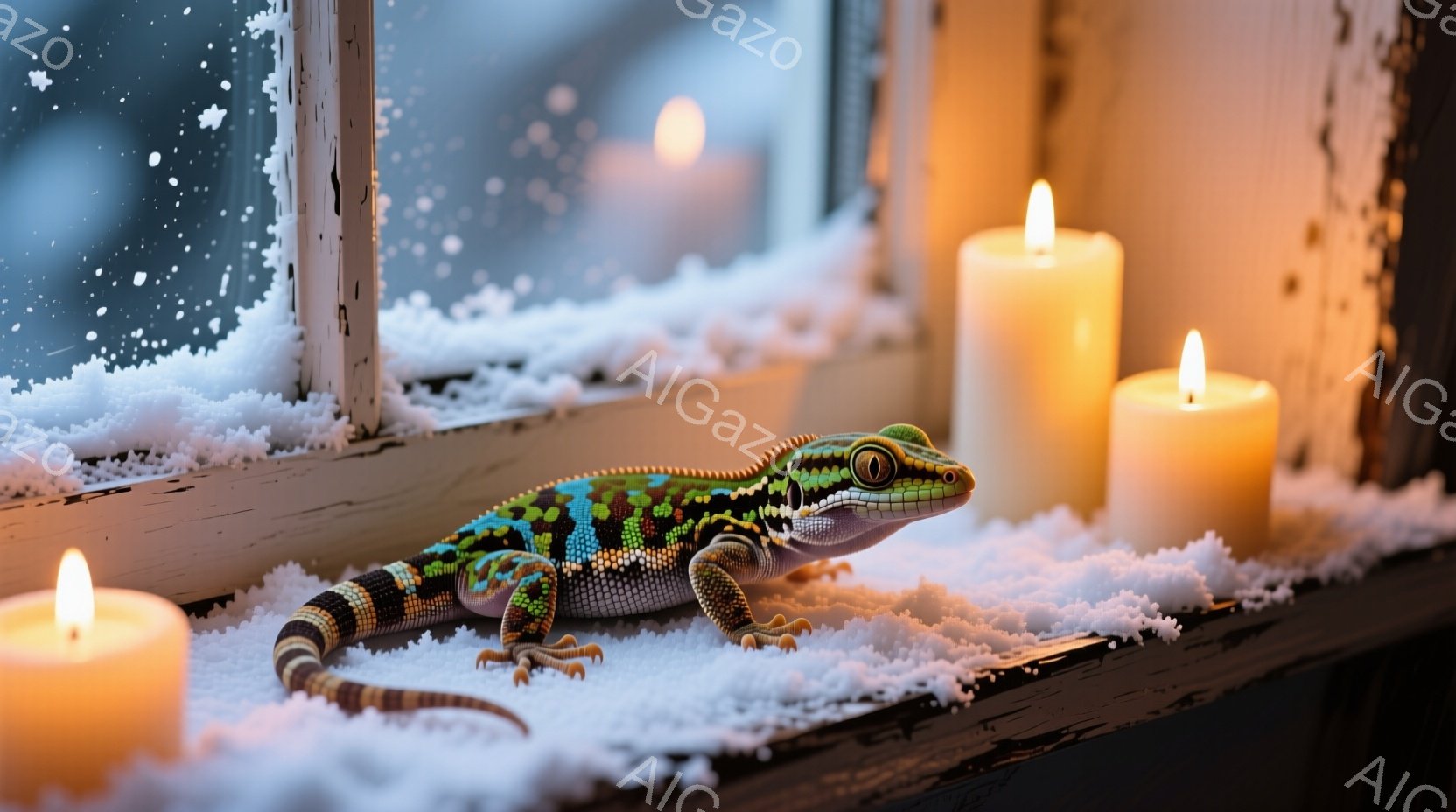 白い雪の上に、鮮やかな緑と黒の模様を持つヤモリが横たわっています。周囲には灯りのともったキャンドルが置かれ、暖かく幻想的な雰囲気を醸し出しています。背景には雪景色が見え、まるで冬の夜の静寂と温もりを描いた絵画のようです。