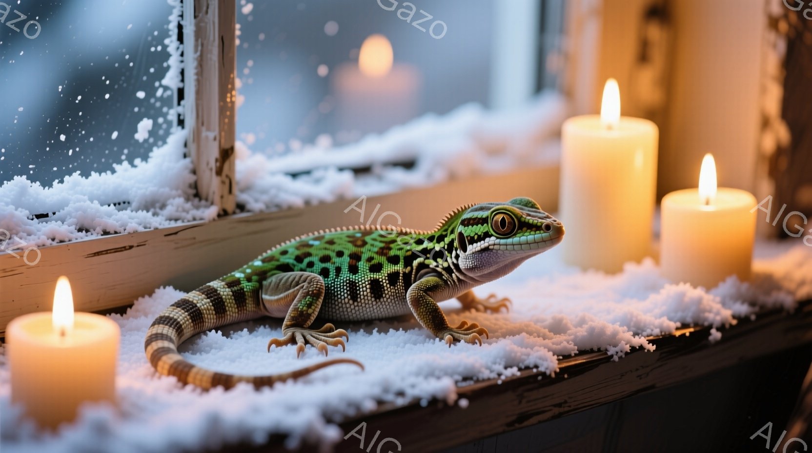 白い窓枠に雪が積もり、その上に鮮やかな色のトカゲが横たわっています。周囲には火の灯ったキャンドルが置かれ、暖かく幻想的な雰囲気を醸し出しています。雪景色を背景に、トカゲの存在がまるで冬の夢のような、不思議な光景を作り出しています。