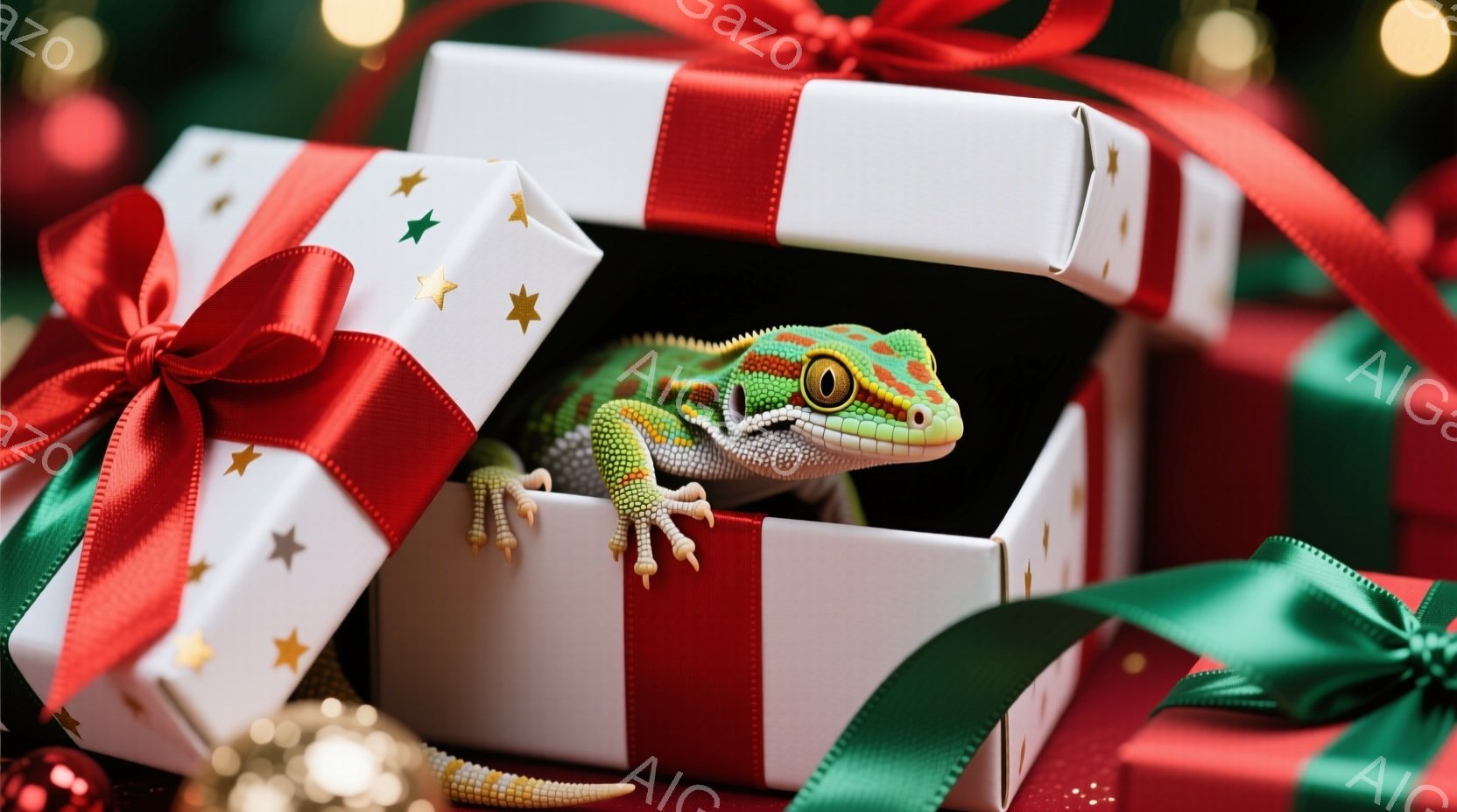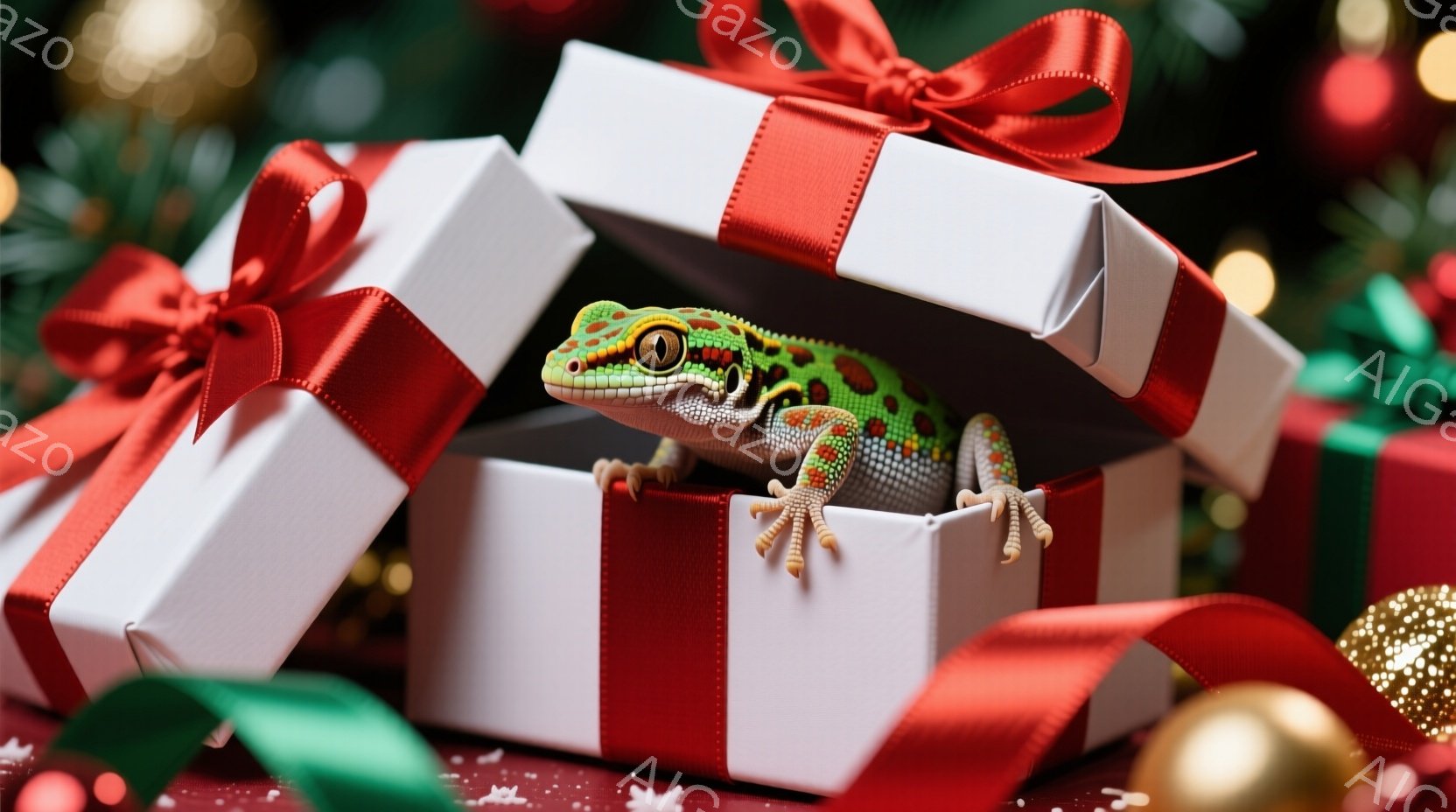 白いギフトボックスの中から、鮮やかな緑色のトカゲが顔を出しています。トカゲは好奇心旺盛な表情でカメラを見つめており、ギフトボックスの赤いリボンや緑色のストリーマーが、お祝いの雰囲気を醸し出しています。背景にはぼやけた赤い布と金色の輝きがあり、全体的に華やかで楽しいムードが漂っています。