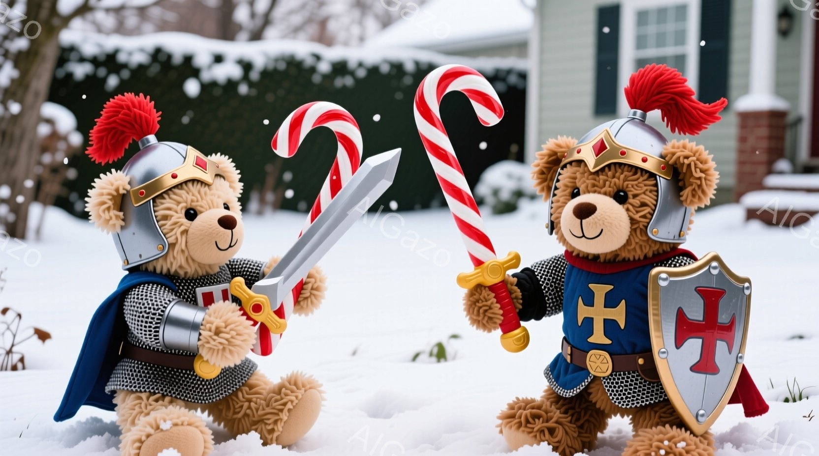 雪景色の中に、中世騎士の衣装を着た2体のテディベアが立っている。片方のベアは銀色の剣を構え、もう片方のベアは赤い十字架が描かれた盾を持っている。背景には住宅と雪に覆われた植物が見え、全体的にファンタジーで遊び心のある雰囲気が漂っている。