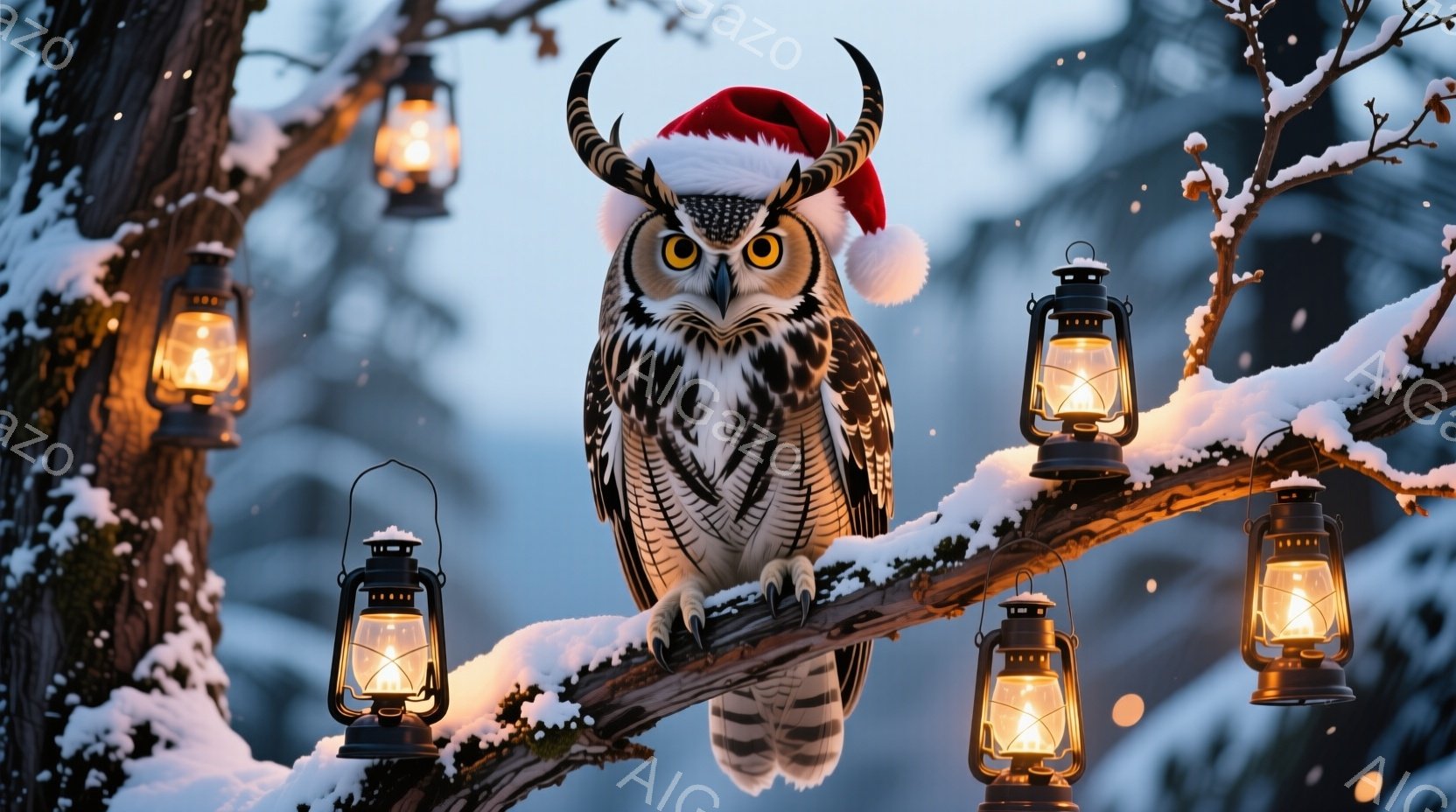 白い雪が降り積もる中、フェンスの上に鮮やかな色のヤモリがとぐろを巻いています。ヤモリは緑とオレンジの縞模様を持ち、大きな瞳で前方をじっと見つめています。背後には、雪で覆われた木々があり、暖かい光を放つランタンがヤモリの傍らに吊るされています。