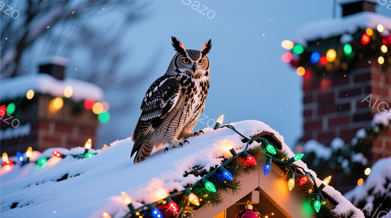 雪に覆われた屋根の上に、大きなフクロウがとまっています。フクロウは鋭い眼差しで正面を見ており、冬の寒さにも負けない凛々しい姿です。背景にはクリスマスのイルミネーションが輝き、雪景色と相まって幻想的な雰囲気を醸し出しています。