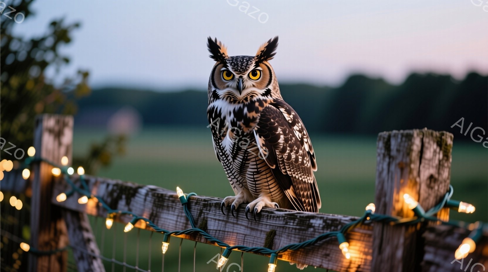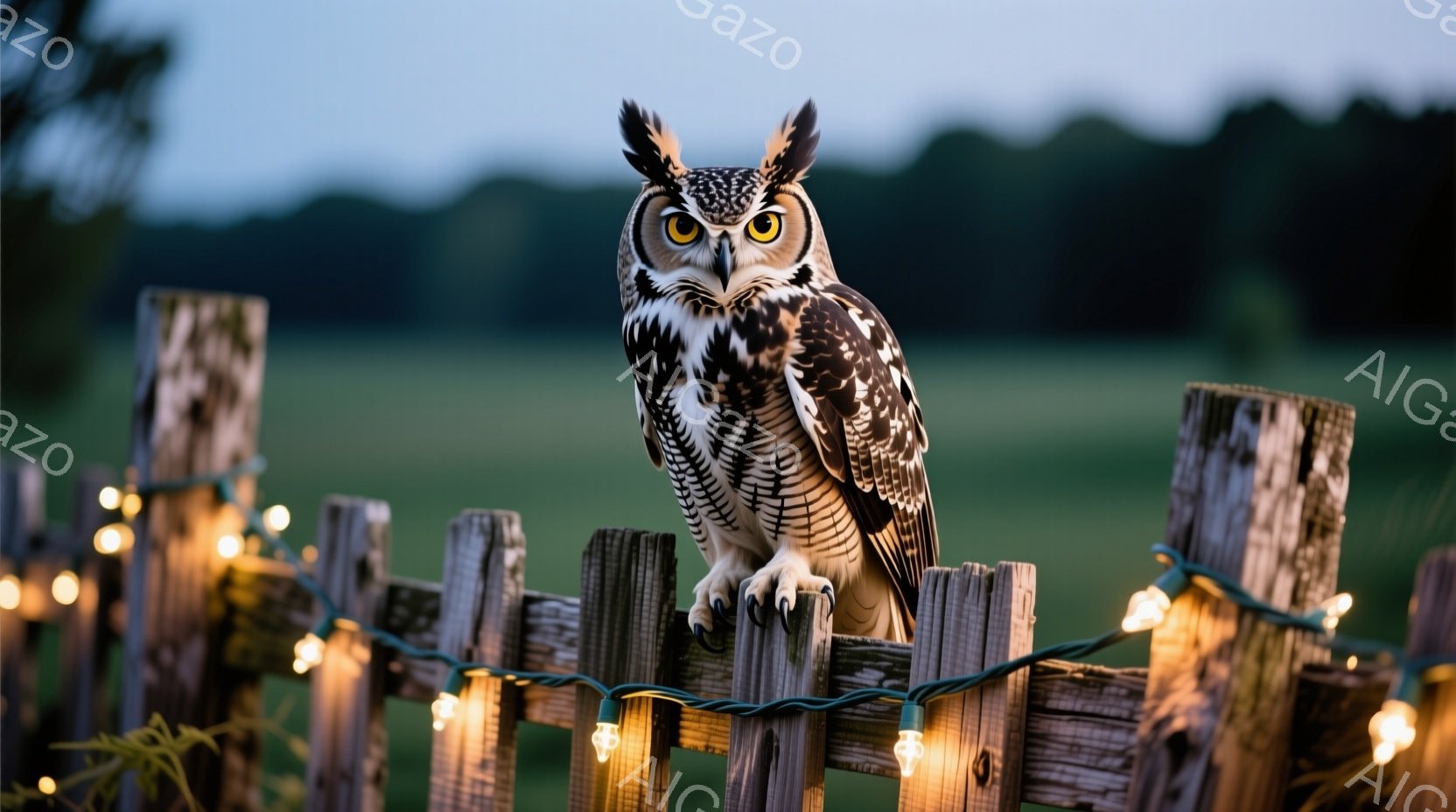 木製の柵に止まっているフクロウが写っている。フクロウは鋭い眼差しで正面を見つめ、茶色と白の模様が特徴的な羽毛を持つ。背景には緑の草原が広がり、夕暮れ時の空が穏やかな雰囲気を醸し出している。