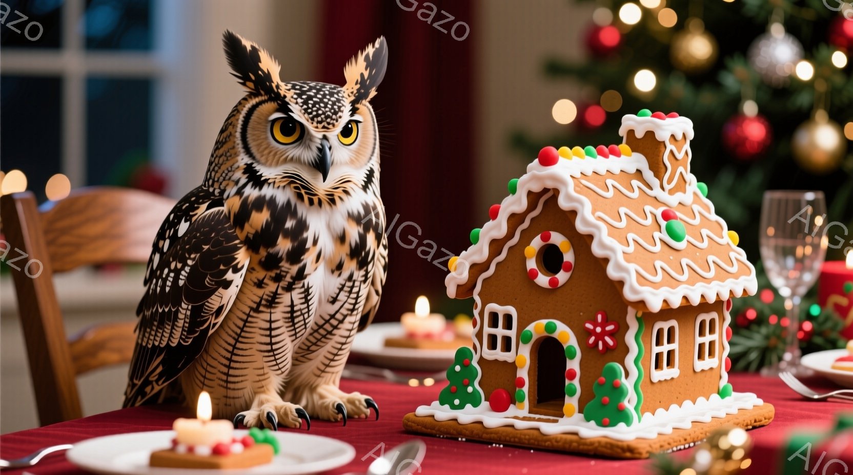 大きなフクロウが、金色のガーランドに覆われて正面を見つめている。背景には、暖炉の炎とぼんやりとしたクリスマスの飾りが見え、温かく、居心地の良い雰囲気が漂う。フクロウは鋭い眼光で何かを捉えようとしているようで、その姿はどこか神秘的だ。