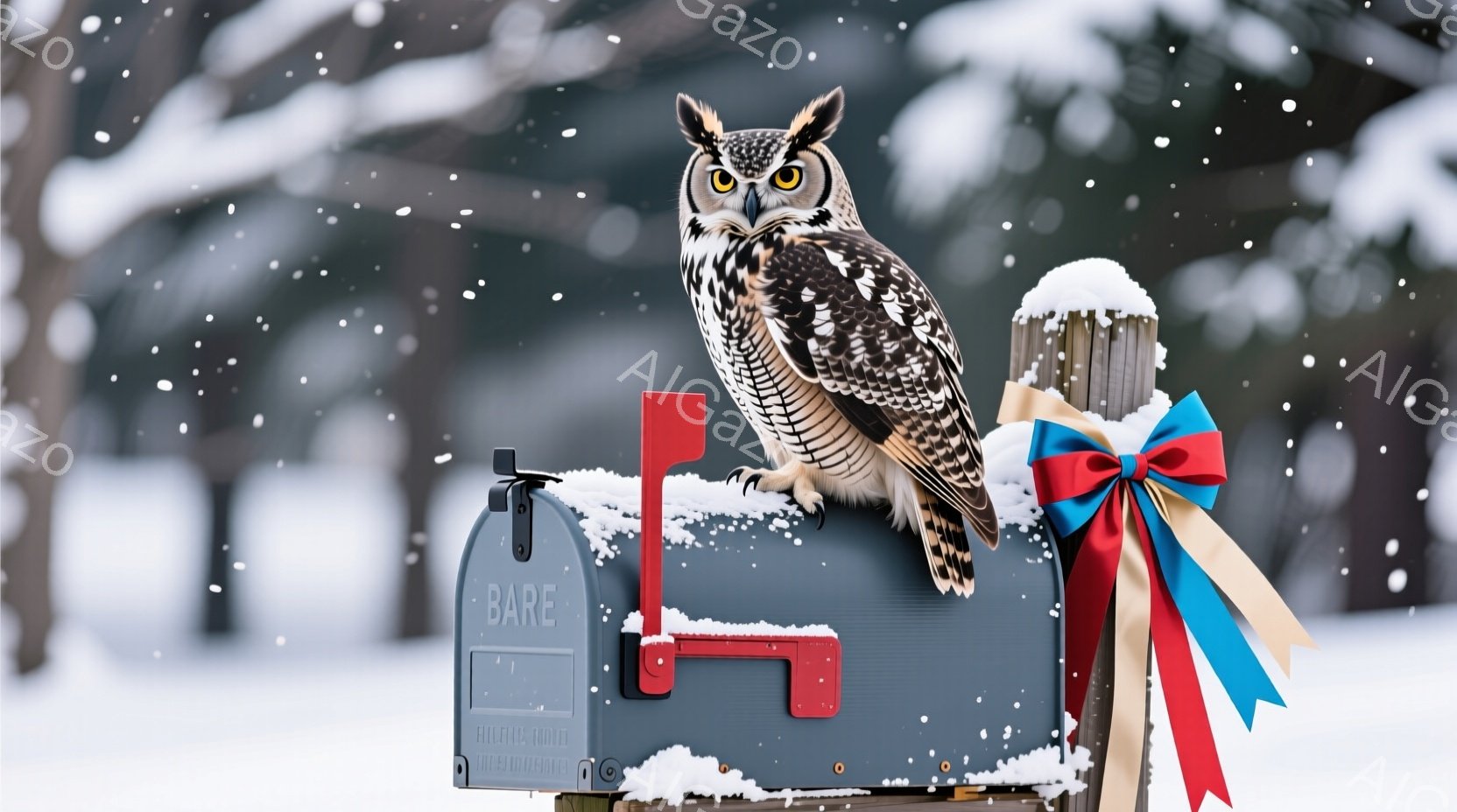 雪が降る中で、2羽のフクロウが郵便ポストの上に座っています。フクロウたちは鋭い眼差しで正面を見つめ、冬の厳しい寒さに耐えているように見えます。背景は白く雪景色で、郵便ポストにはオレンジ、赤、青のリボンが飾られています。