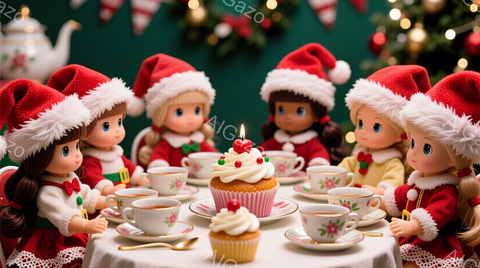 赤いサンタ帽をかぶった可愛らしい人形たちが、クリスマスの食卓を囲んでいる。人形たちは赤いセーターとチェック柄のスカートを着ており、テーブルの上にはカップケーキや小さなお菓子が並べられている。背景には緑色の壁とキラキラと光るクリスマスツリーがあり、暖かく、お祝いの雰囲気を醸し出している。
