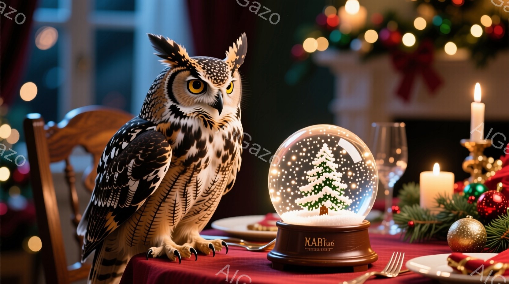 暖炉のそばに置かれたダイニングテーブルの上で、大きなフクロウの置物が雪の結晶の入ったガラス球の隣に立っている。背景にはぼやけたクリスマスツリーの光と、キャンドルや食器が置かれた食卓が見え、暖かく華やかなクリスマスの雰囲気が漂っている。フクロウは堂々とした姿勢で、鋭い眼光でこちらを見ている。