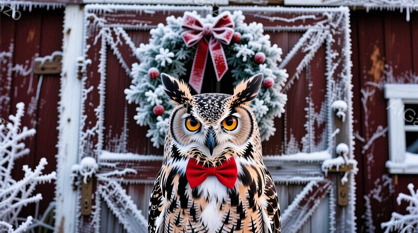 雪が舞う中で、大きなフクロウが雪に覆われた柵の上に座っている。背景には、温かい光を放つ提灯が連なり、冬の静けさと暖かさが対照的に表現されている。フクロウは鋭い眼差しでこちらを見つめ、凛とした雰囲気を醸し出している。
