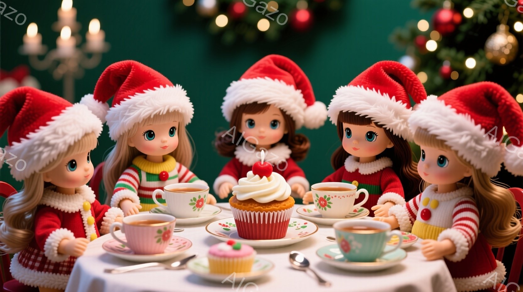 ジンジャーブレッドで作られた列車が、雪の上に敷かれた線路の上を走っています。列車は、ジンジャーブレッドで作られた丸太やキャンディケーンを積んだ貨車で構成され、煙突からは白い綿菓子のような蒸気が立ち上っています。背景には、緑色のクリスマスツリーやジンジャーブレッドで作られた家があり、雪の結晶やカラフルなキャンディが散りばめられており、温かくお祭り気分な雰囲気です。