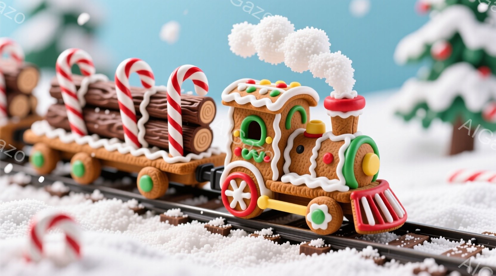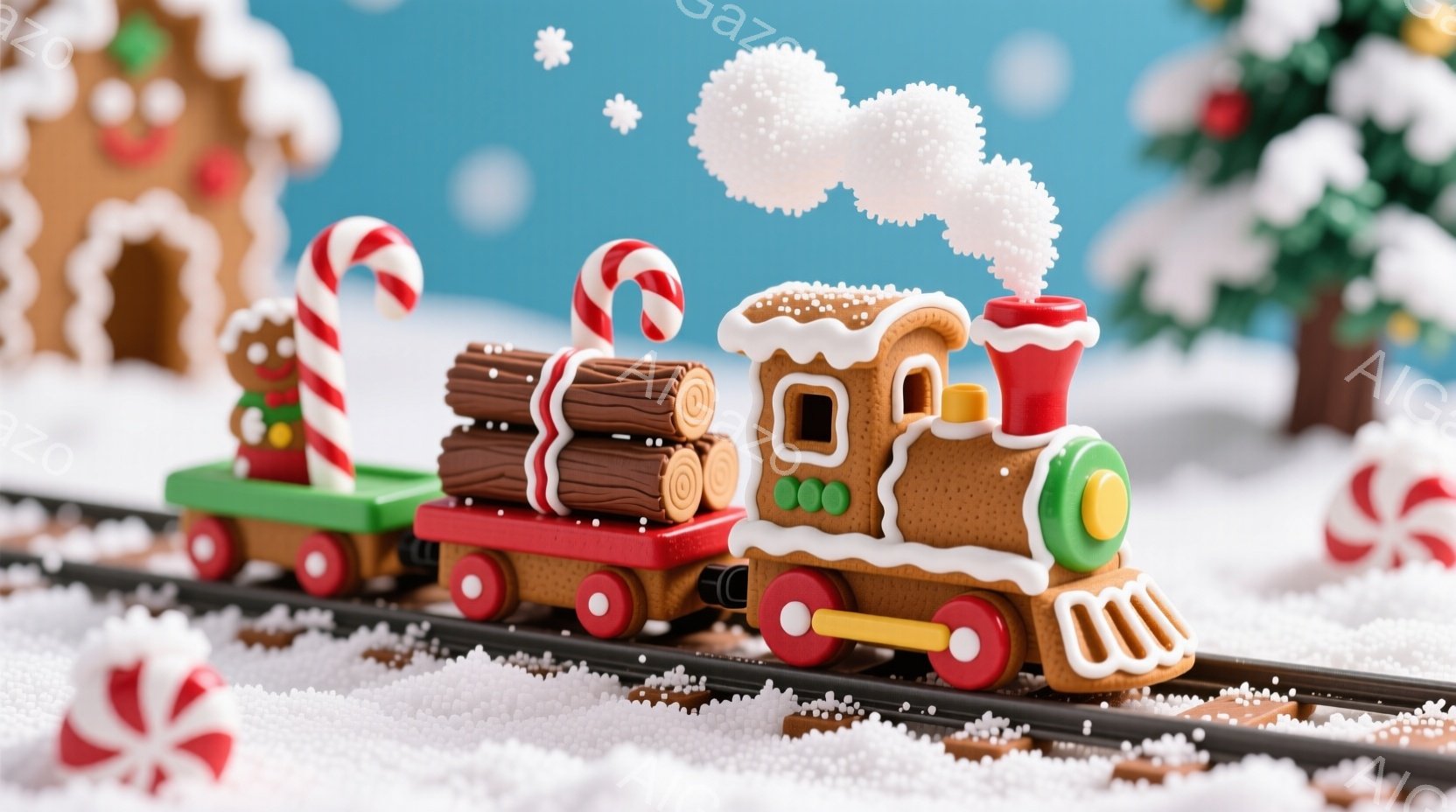 砂糖菓子で作られた列車が雪景色の中で走っています。車体はジンジャーブレッドで、キャンディケーンやチョコレートのログが積まれた貨車が連なっています。背景には雪で覆われた木々と、可愛らしいジンジャーブレッドの家が見え、暖かく幻想的なクリスマスの雰囲気が漂っています。