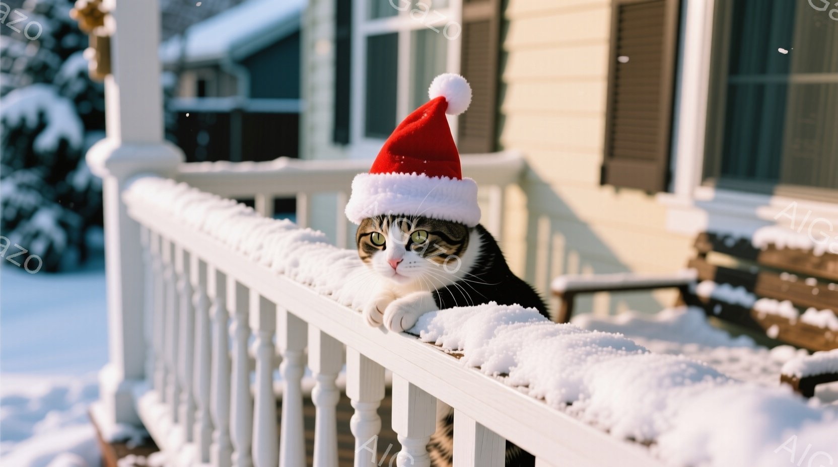 白い手すりに雪が積もり、その上に赤いサンタ帽をかぶった白いふわふわの生き物がちょこんと座っています。背景には雪で覆われた家の外観が見え、冬の静かで穏やかな雰囲気が漂っています。雪が舞い、全体的にクリスマスの温かく幻想的な世界観が表現されています。