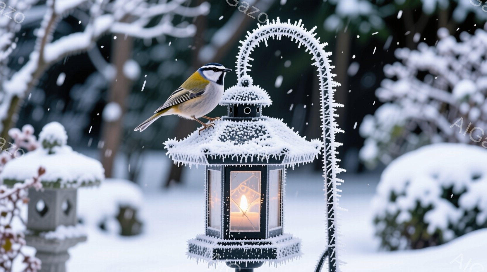 雪が降り積もる中で、一羽の小鳥が雪で覆われた石灯籠の上に止まっています。小鳥は鮮やかな色彩を持ち、雪景色の中で際立って見えます。背景には雪に覆われた木々や建物があり、静かで幻想的な冬の雰囲気を醸し出しています。