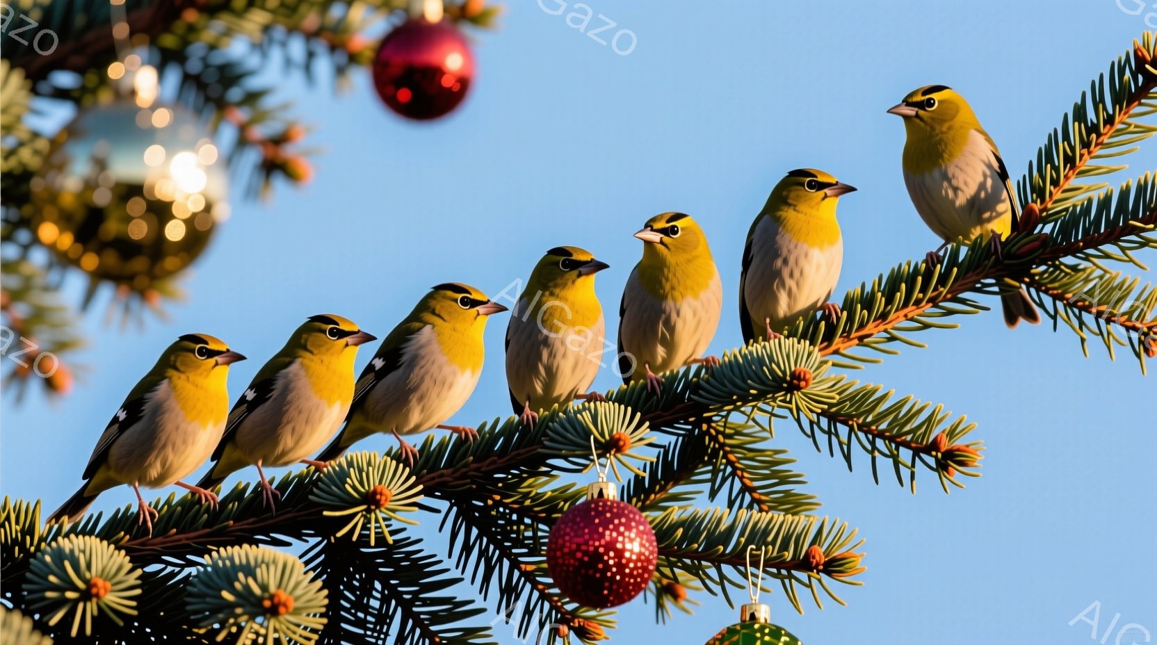 鮮やかな黄色の鳥が、クリスマスのモミの木の枝に一列に並んで座っています。赤いオーナメントが木に飾られ、背景は穏やかな青空です。鳥たちは皆同じ方向に視線を向け、静かで穏やかな雰囲気が漂っています。