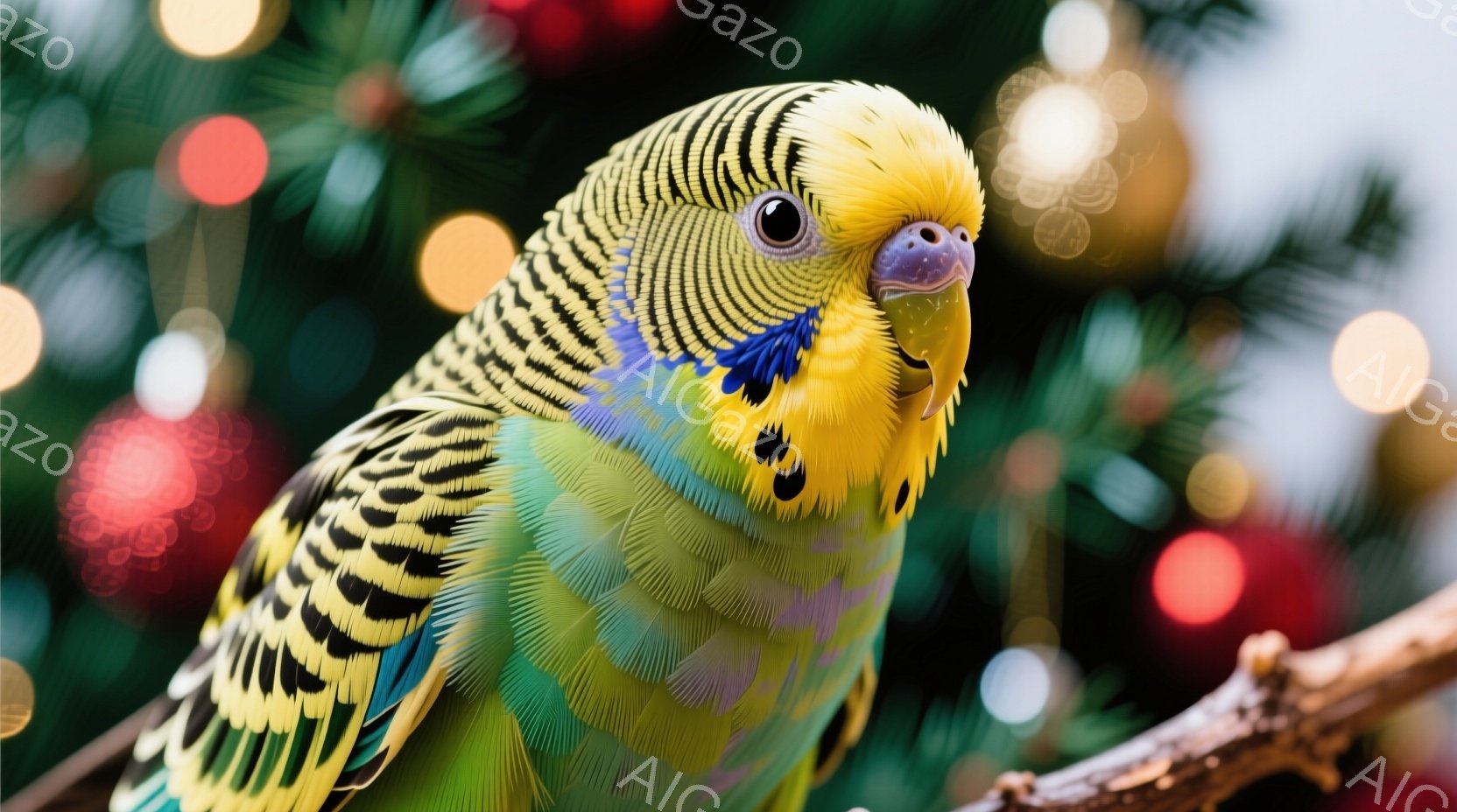 セキセイインコが枝に止まっており、鮮やかな緑、黄色、黒色の羽が特徴的です。その表情は好奇心旺盛で、少し上を見ている様子が可愛らしいです。背景にはぼやけたクリスマスツリーの飾りが見え、全体的に温かく、お祝いの雰囲気が漂っています。